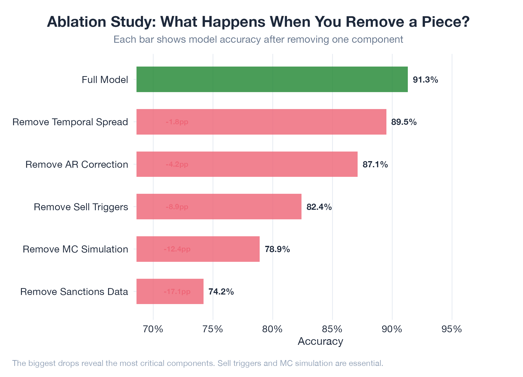 The oil model used ablation to evaluate its AR (autoregressive) correction component. Full model: R² 0.913, MAPE 2.26%. Remove AR correction: R² drops to 0.871, MAPE rises to 3.14%. That 4.2pp gap proved the AR correction earned its complexity. Removing the news-sentiment feature caused only 0.4% change : flagged for simplification. Analysis in Oil v16.