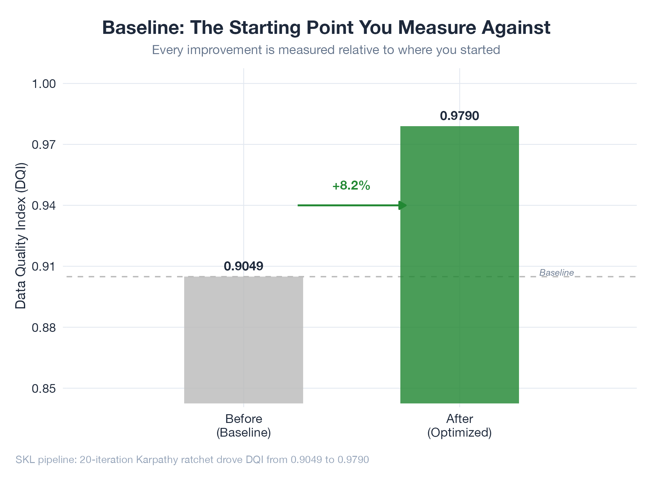 Record current metric → document conditions precisely → run experiment → compare against baseline. The baseline is the initial value in a Karpathy ratchet : the floor that can only go up.