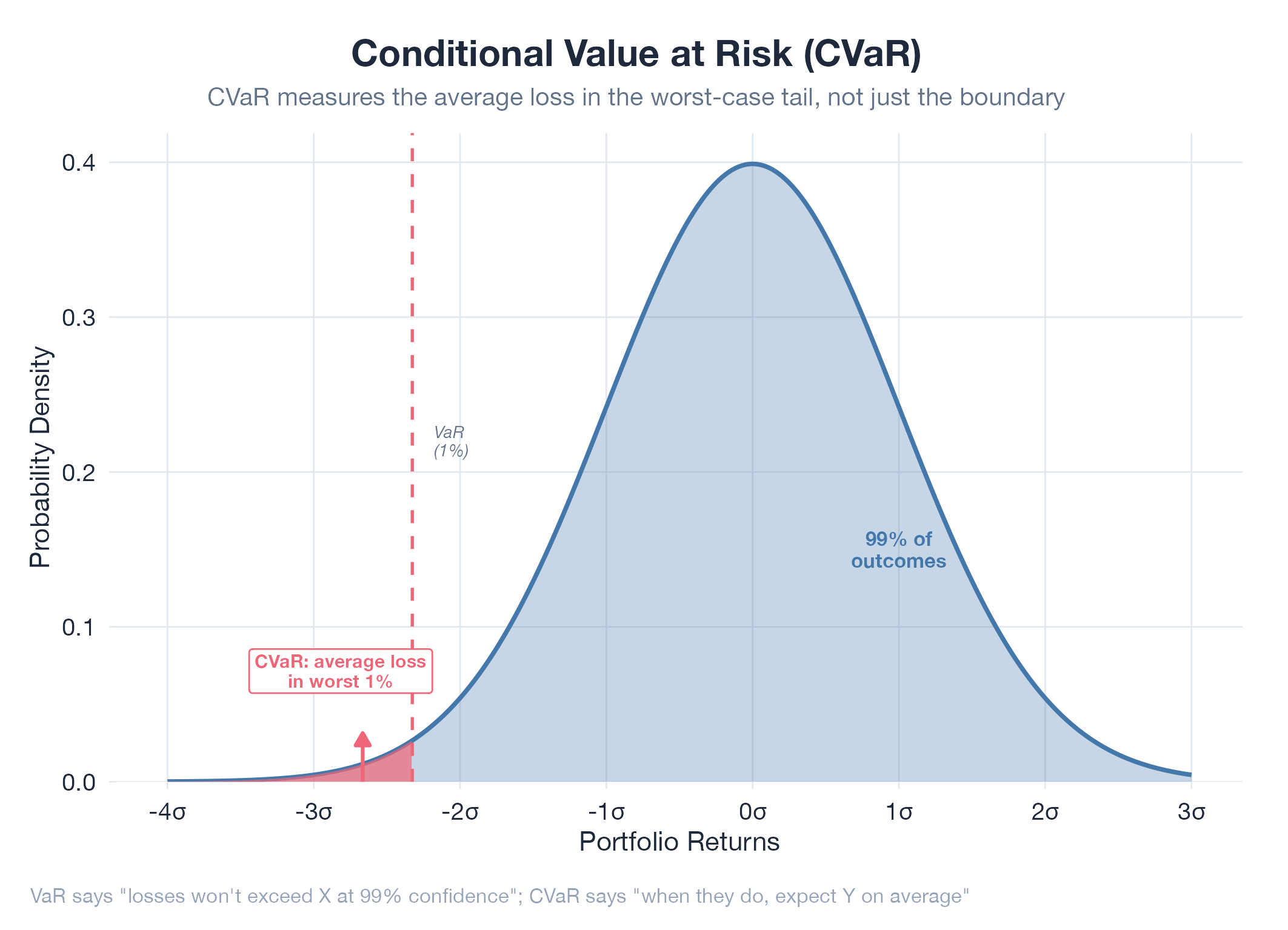 CVaR (also called Expected Shortfall) focuses on the tail of your loss distribution: the worst X% of outcomes. Pick a 95% confidence level : that means you’re looking at the worst 5% of scenarios : then average the losses across only those worst-case scenarios. Compare this to VaR (Value at Risk), which just tells you where the cliff edge is (“5% chance losses exceed $3.50/barrel”). CVaR tells you how far you fall: “in that worst 5%, you lose $5.20/barrel on average.” CVaR is always worse than VaR, and that’s exactly the point.