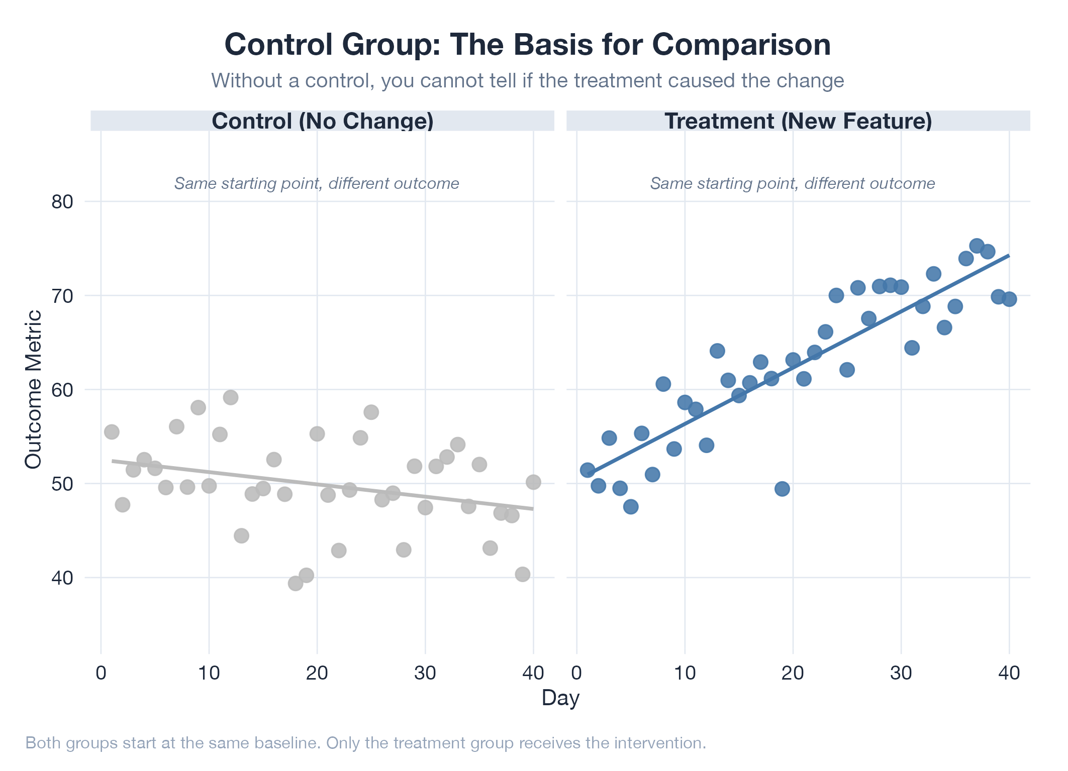 A control group is the “nothing changed” version of reality that makes your “something changed” version meaningful. Same soil, same sunlight, same water : except you added fertilizer to one half of the garden. If the fertilized plants grow taller, you know the fertilizer did it because everything else was identical. Without a control group you can’t attribute differences to your change versus background noise, seasonal effects, or anything else that happened at the same time. Random assignment to groups is the whole game: it distributes unknown confounders evenly.