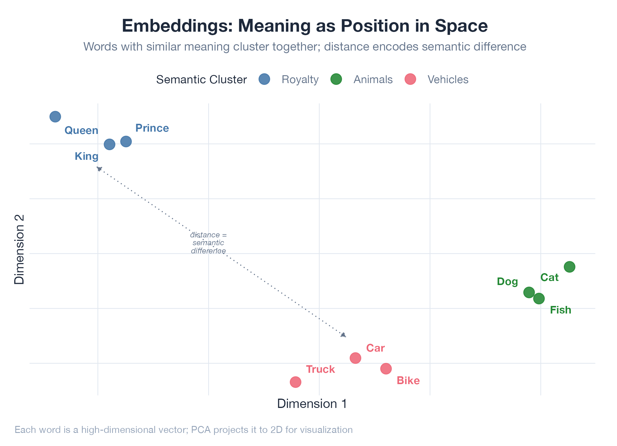 Embeddings are coordinates on a map of meaning. An embedding model converts text into a list of ~768–3,072 numbers (a vector), learned from billions of examples, that encode semantic relationships. “Dog” and “cat” land near each other. “Dog” and “algebra” are on different continents. Crucially, “The CEO resigned” and “The company’s leader stepped down” produce very similar vectors even though they share almost no words : the model has learned they mean the same thing. Similarity is measured with cosine distance: 0.95 = nearly identical, 0.30 = barely related.