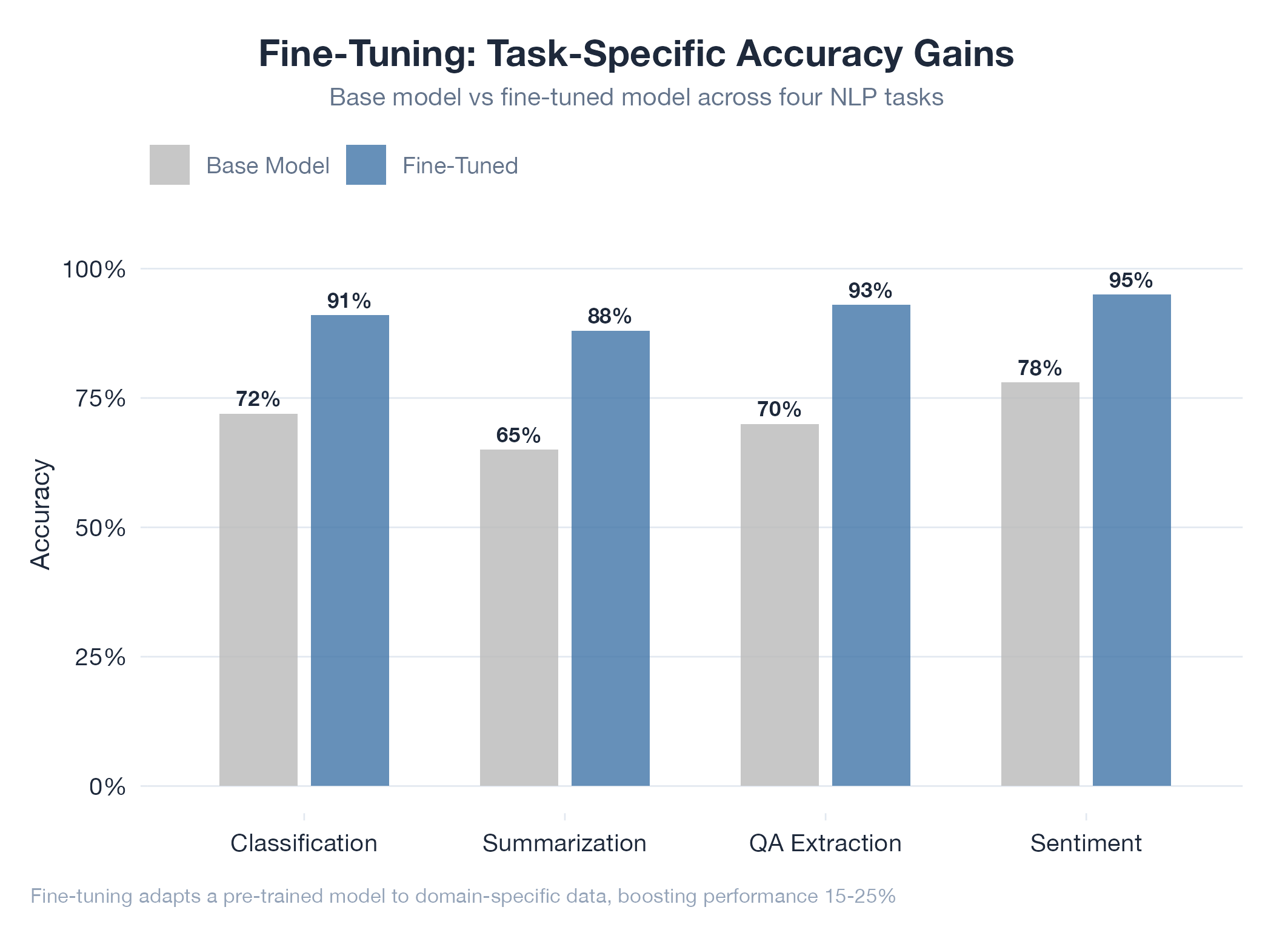 Fine-tuning takes a large pre-trained model that already understands language and reasoning, then continues training it on a smaller, targeted dataset to make it an expert at your specific task. It keeps everything it already learned but gets much better at the thing you care about. This sits between prompt engineering (no weight changes) and training from scratch (billions of tokens, millions of dollars): more powerful than prompting, far cheaper than pre-training. The main risk is catastrophic forgetting : the model improves at your task but degrades at everything else if done carelessly.