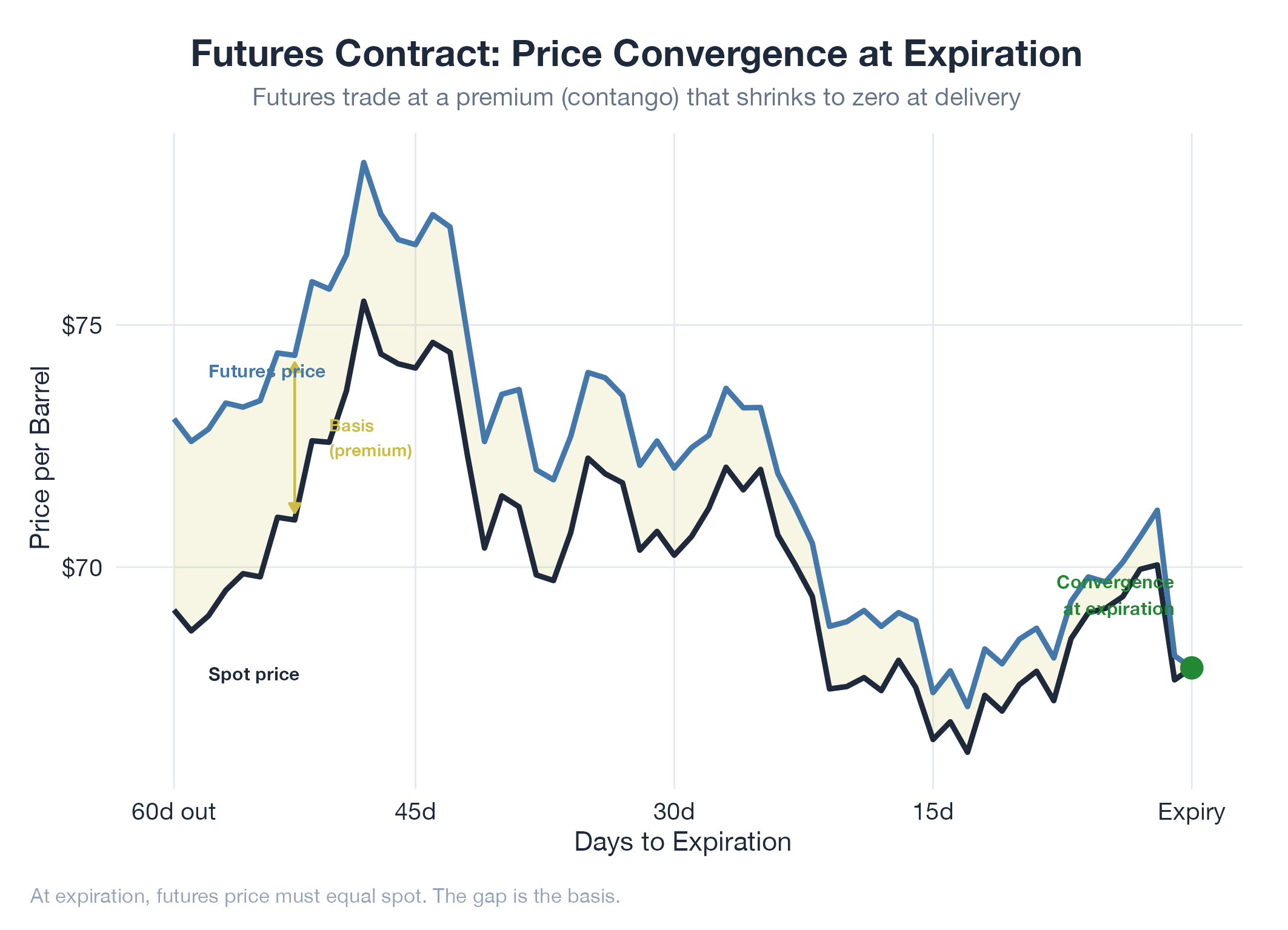 A futures contract is a standardized agreement to buy or sell an asset at a set price on a specific future date, traded on an exchange. The farmer locks in revenue selling wheat at today’s price for October delivery; the baker locks in input costs. Neither cares what the market does between now and then. Key mechanics: long positions profit when prices rise, short positions profit when they fall. Margin (5–15% of contract value) creates leverage. Most futures are closed before expiration : physical delivery rarely happens. The “CL” in cl-futures-hormuz is the CME’s WTI Crude Oil symbol: each contract = 1,000 barrels, so a $1 move means $1,000/contract.