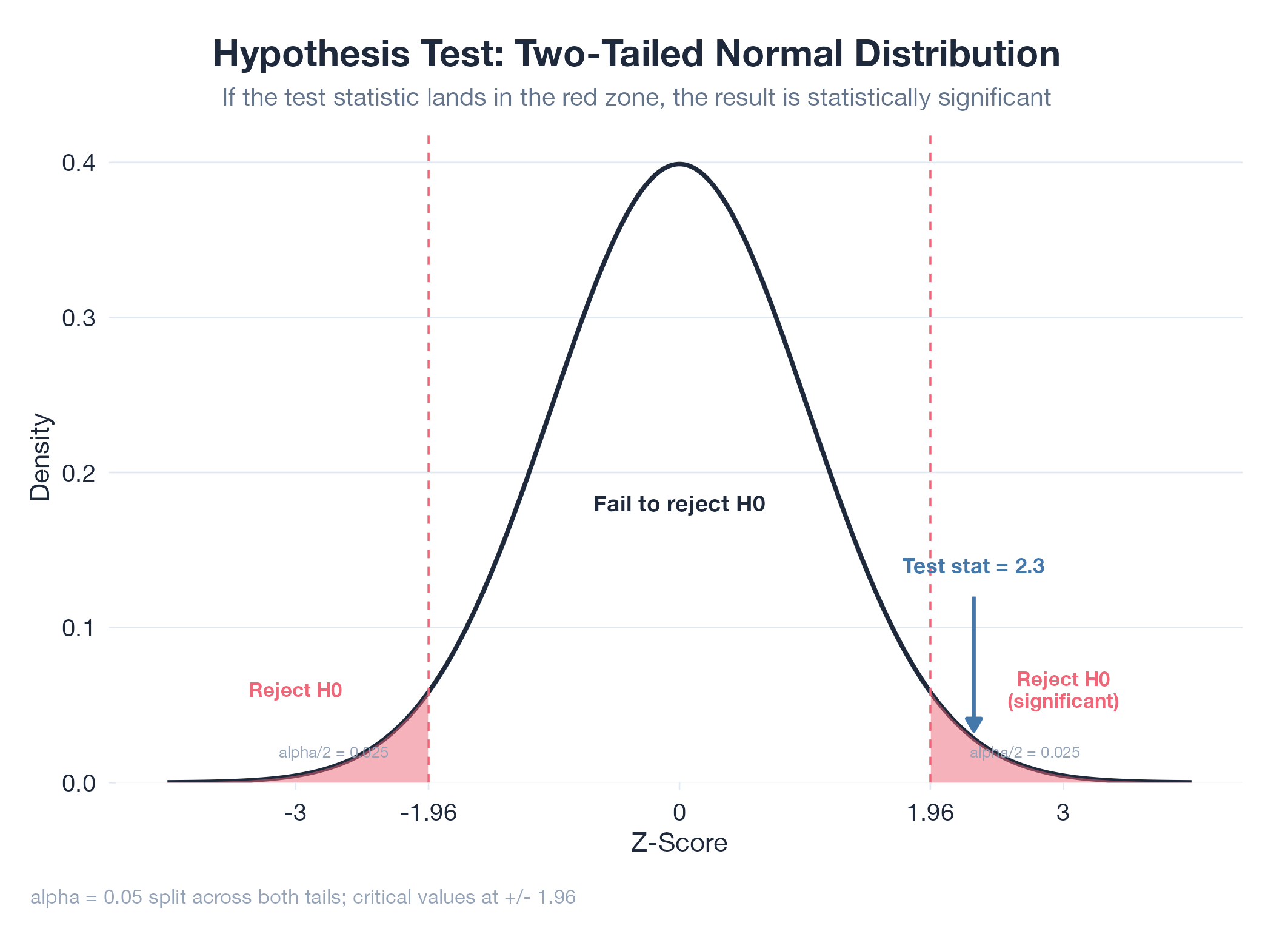 The oil model tests “expanding the MC time window to 360 days will improve forward accuracy.” The LinkedIn engine tests “adding a hydration wait will increase form submission rate.” Every experiment file starts with the hypothesis. Without it, you can’t evaluate the result. Framework for A/B tests and statistical significance.