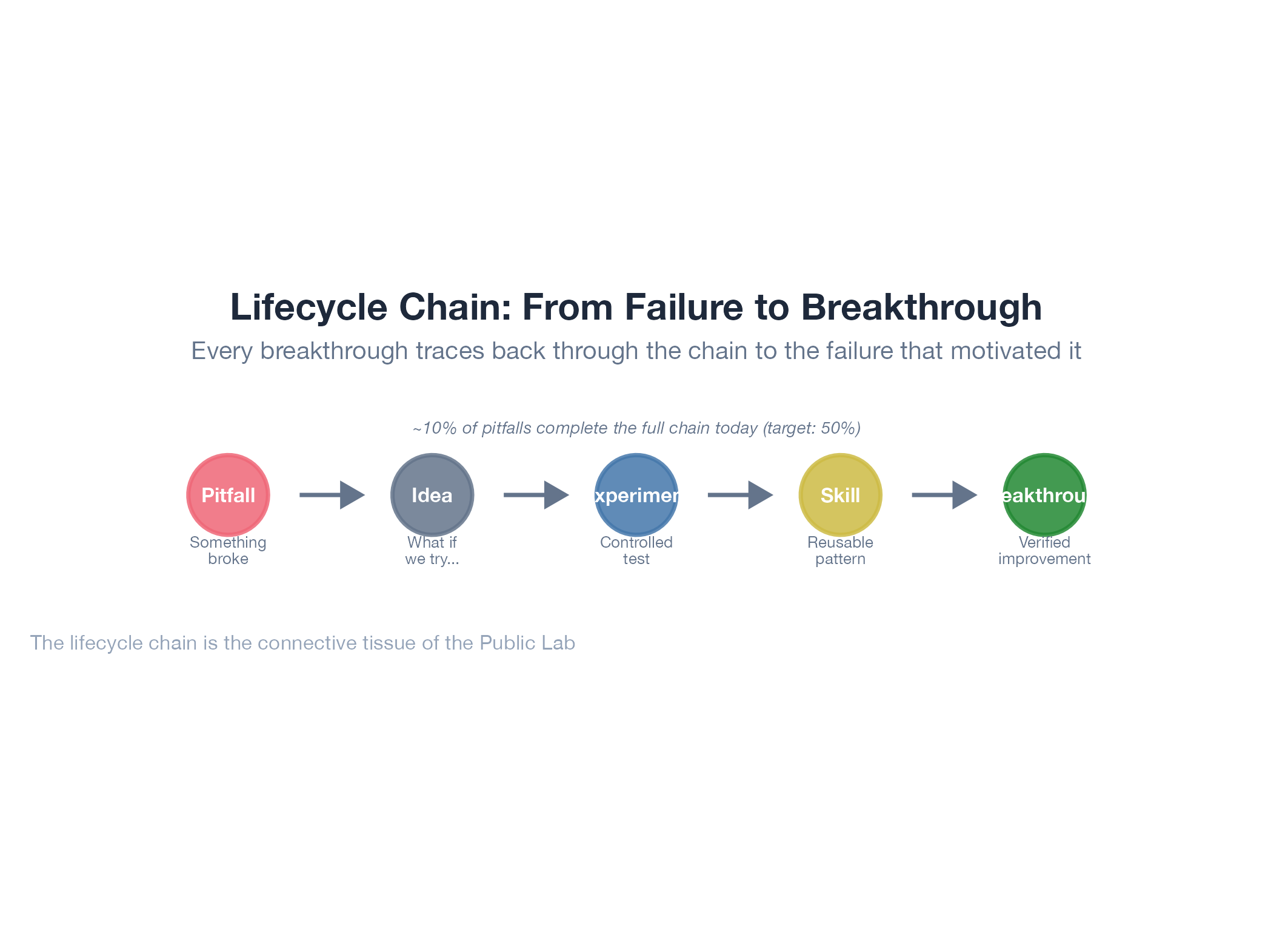 Six dimensions form the nodes: Bugs → Pitfalls → Research → Ideas → Experiments → Breakthroughs. Every note should link forward (what this enables) and backward (what problem it addresses). The Sankey diagram on the Public Lab website visualizes these flows.