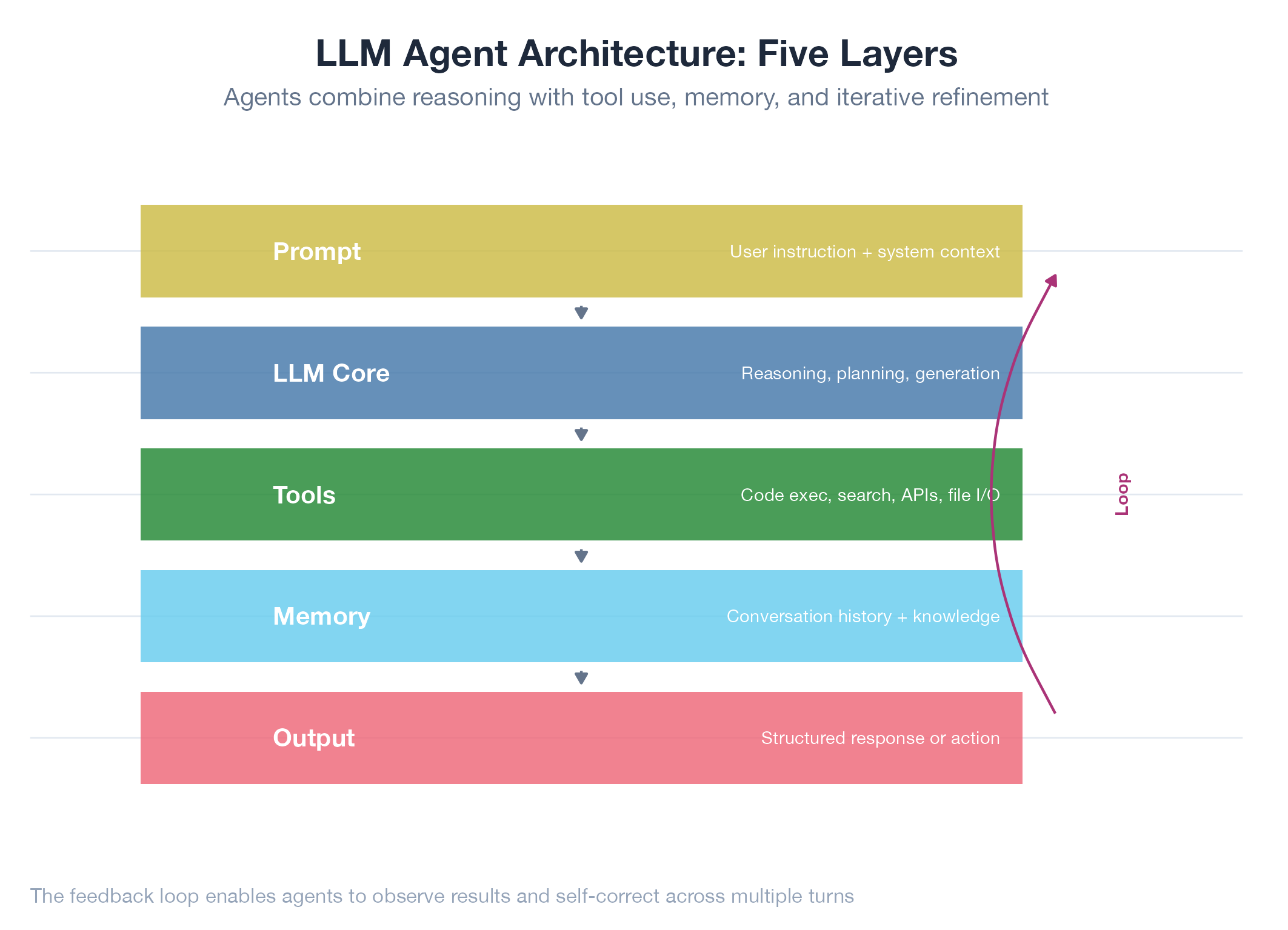 An LLM agent is a language model that takes actions, not just answers questions. Given a goal, it decides which tools to call, interprets results, updates its plan, and repeats until done. The architecture has four layers: tool use (structured function calls the harness executes), memory (short-term context + optional long-term knowledge store), planning (goal decomposition, progress tracking, replanning on failure), and multi-agent coordination (role assignment and communication between specialized agents). The shift from “LLM as chat” to “LLM as agent” transforms a knowledge retrieval tool into an autonomous system.
