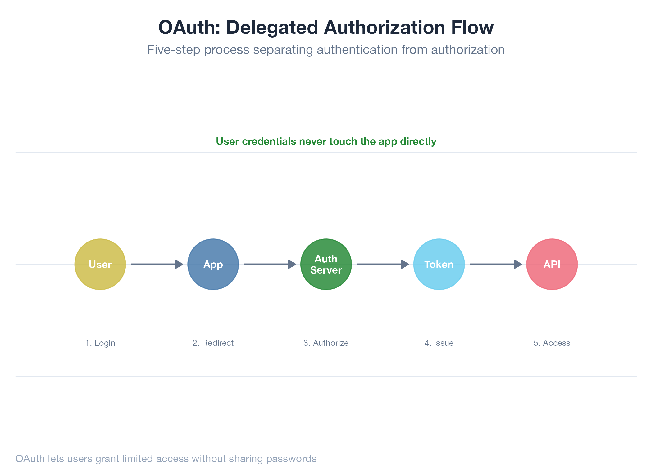 OAuth is a delegation protocol: instead of giving an app your password, you tell the service “yes, this app can read my email” and the service hands the app a time-limited token : a hotel key card that opens your room but not the staff office. The app never sees your credentials. OAuth 2.0 defines several flows; the most common is authorization code + PKCE: redirect to the service’s login page → consent → get a short-lived code → exchange it for access and refresh tokens. Access tokens expire (typically 1 hour); refresh tokens let the app renew them silently.