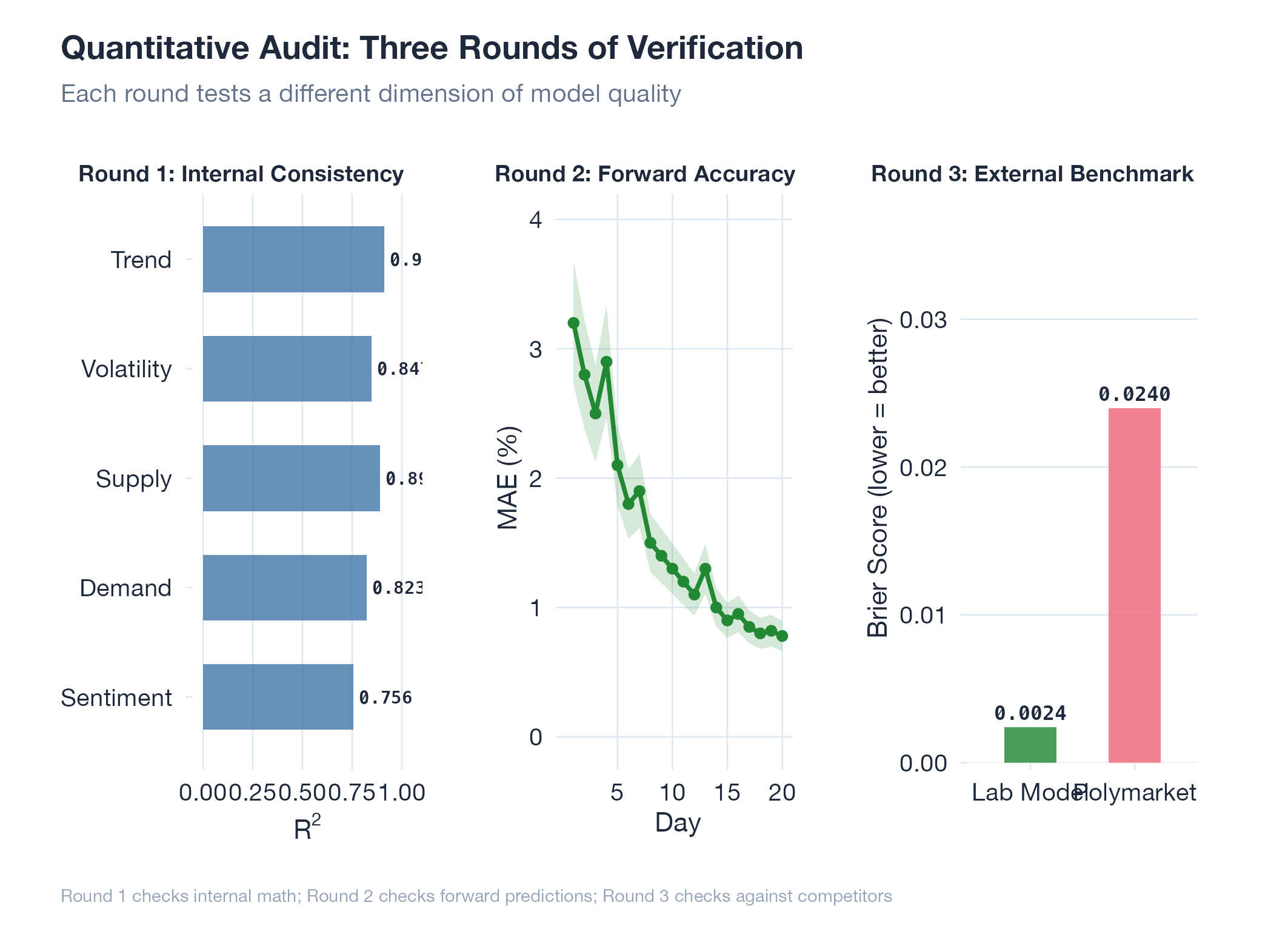 Oil v16’s 3-round audit: Round 1 found two normalization bugs (MC probabilities didn’t sum to 1.0). Round 2 confirmed MAE $1.12, MAPE 2.26%, R² 0.913 over 34 days. Round 3 benchmarked against Polymarket: +2.16pp Brier edge. Three rounds, three different classes of problem found. Details in Oil v16.