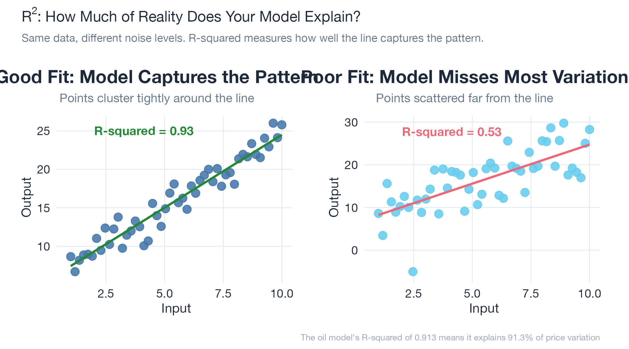 The oil model’s R-squared of 0.913 means it explains 91.3% of price movement in WTI crude futures. For a commodity driven by geopolitics, OPEC decisions, and speculation, capturing that share of variation with a mathematical model is unusually strong. Measured in Oil v16.