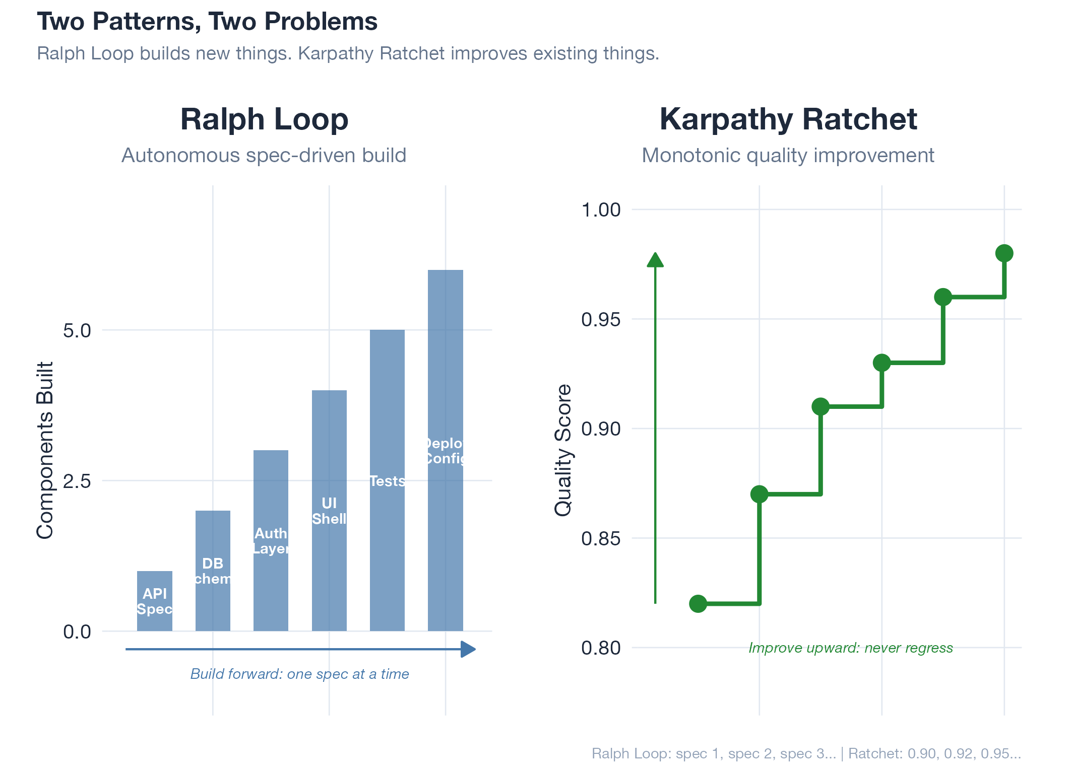 A Ralph Loop is a bash loop that walks through spec files one at a time, hands each to an AI agent (Claude Code), and lets the agent build that component autonomously. When it finishes, the loop advances to the next spec. Three rules: single-spec scoping (the agent sees only ONE spec, not the whole project), error tolerance (no set -e : failure on one spec doesn’t abort the loop), and throwaway-first (the loop builds what’s described; production architecture comes later). Distinct from a Karpathy Ratchet: the Ralph Loop builds new things, the ratchet improves existing ones.