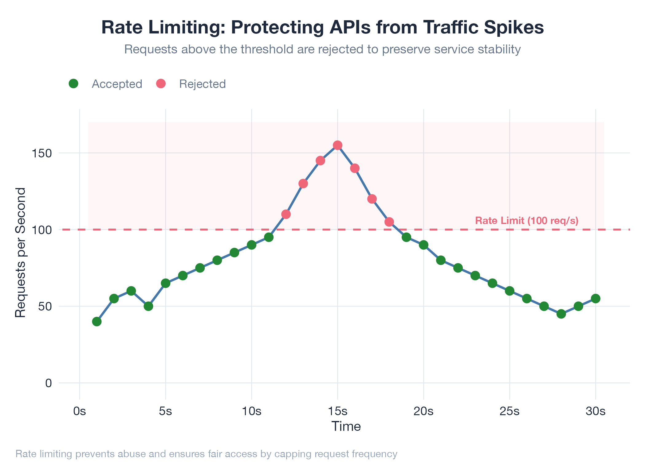Rate limiting controls how many requests a client can make in a given time window : the bouncer that matches traffic to server capacity. Hit the limit and you get a 429 Too Many Requests response with a Retry-After header. Common strategies: fixed window (100 req/min, simple but bursty), sliding window (smooths burst abuse), and token bucket (allows burst up to bucket size while enforcing an average rate). Limits can apply per user, per API key, per IP, or per endpoint. Premium tiers typically get higher limits.