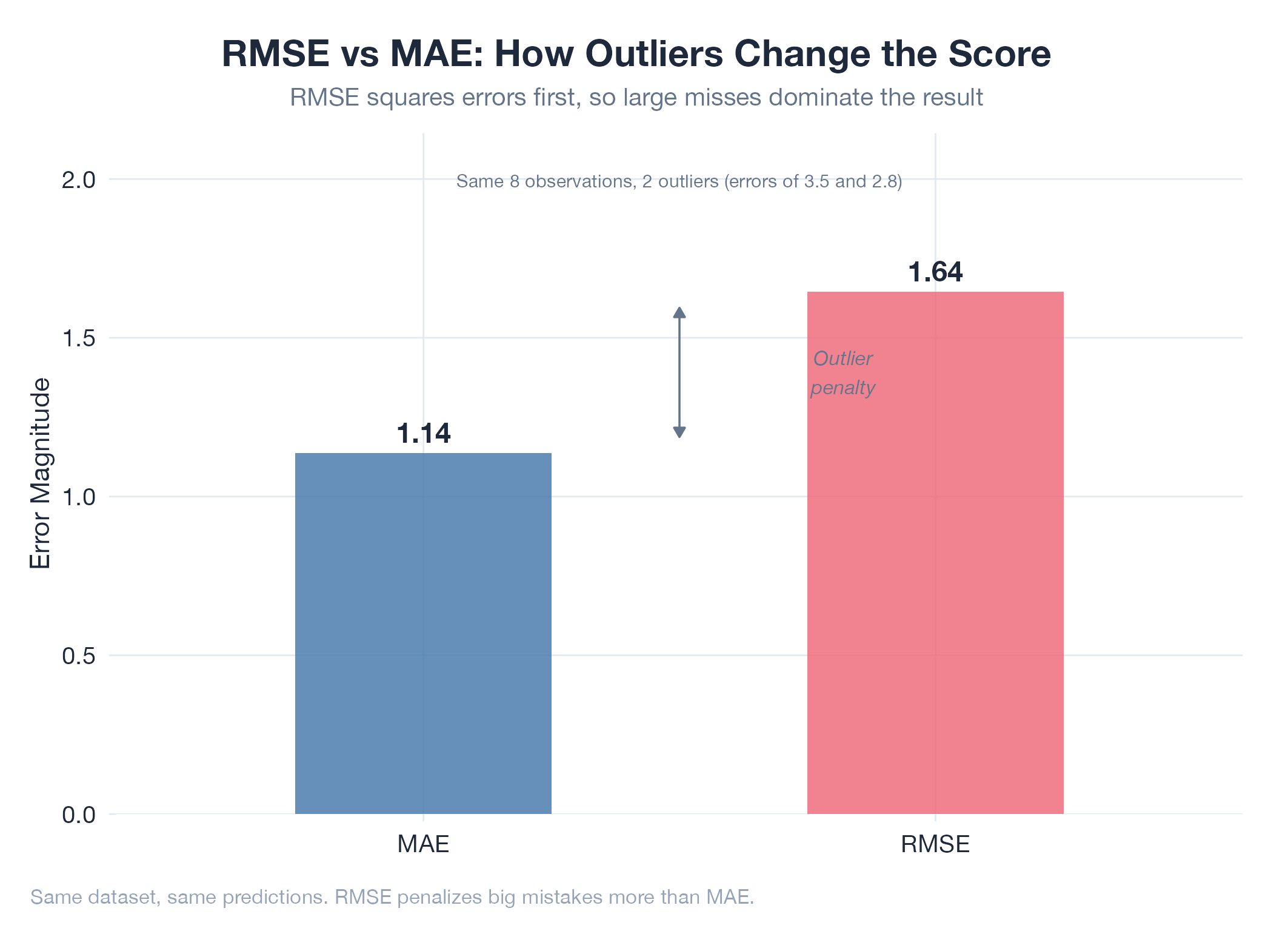 RMSE measures prediction error with a deliberate bias toward large misses. Square each error, average them, then take the square root. The squaring step amplifies outliers: one terrible prediction drags your score down much more than several small misses would. This makes RMSE higher than MAE whenever your errors are inconsistent. If RMSE ≫ MAE, you have outlier predictions worth investigating. If RMSE ≈ MAE, your errors are uniform across all predictions.