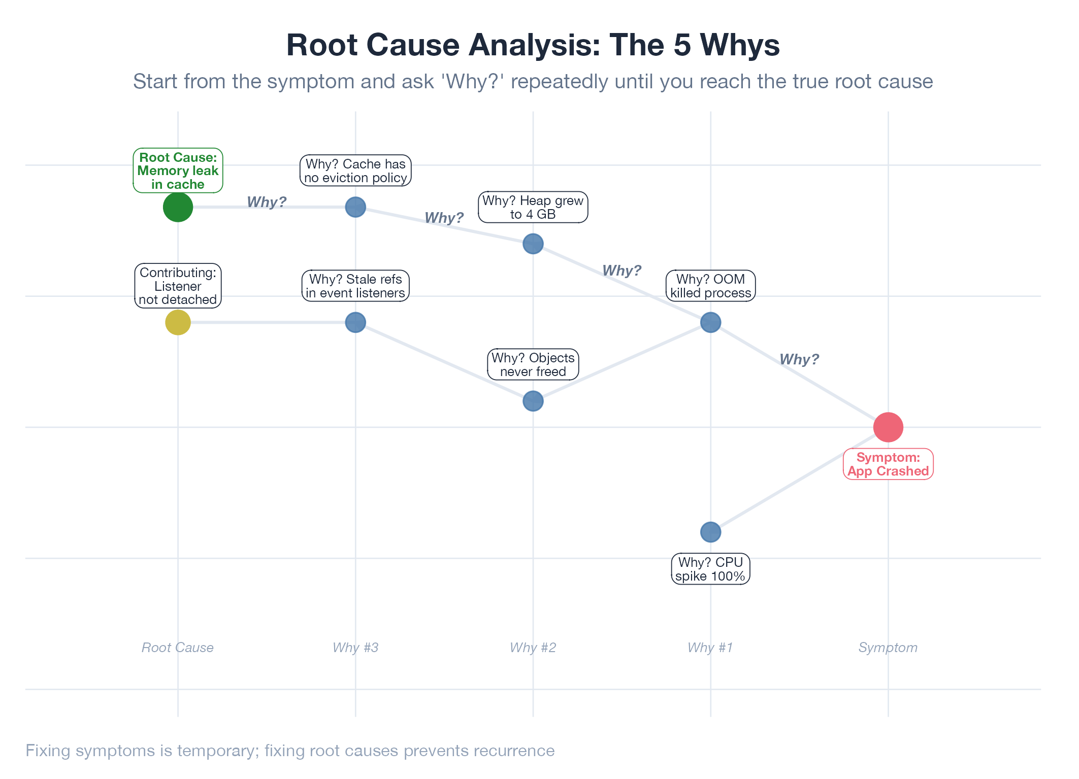 Root cause analysis refuses to stop at symptoms. The Toyota Production System formalized this as the “Five Whys”: ask “why?” five times, and by the fifth answer you’ve usually found the structural origin of a failure. The wet floor is a symptom. The leaking pipe is an intermediate cause. The galvanic corrosion from mismatched metals is the root cause. Fixing the procurement process prevents all future galvanic corrosion issues, not just this one pipe. RCA is how you escape the cycle of symptom-fixing where the same class of bug keeps reappearing.