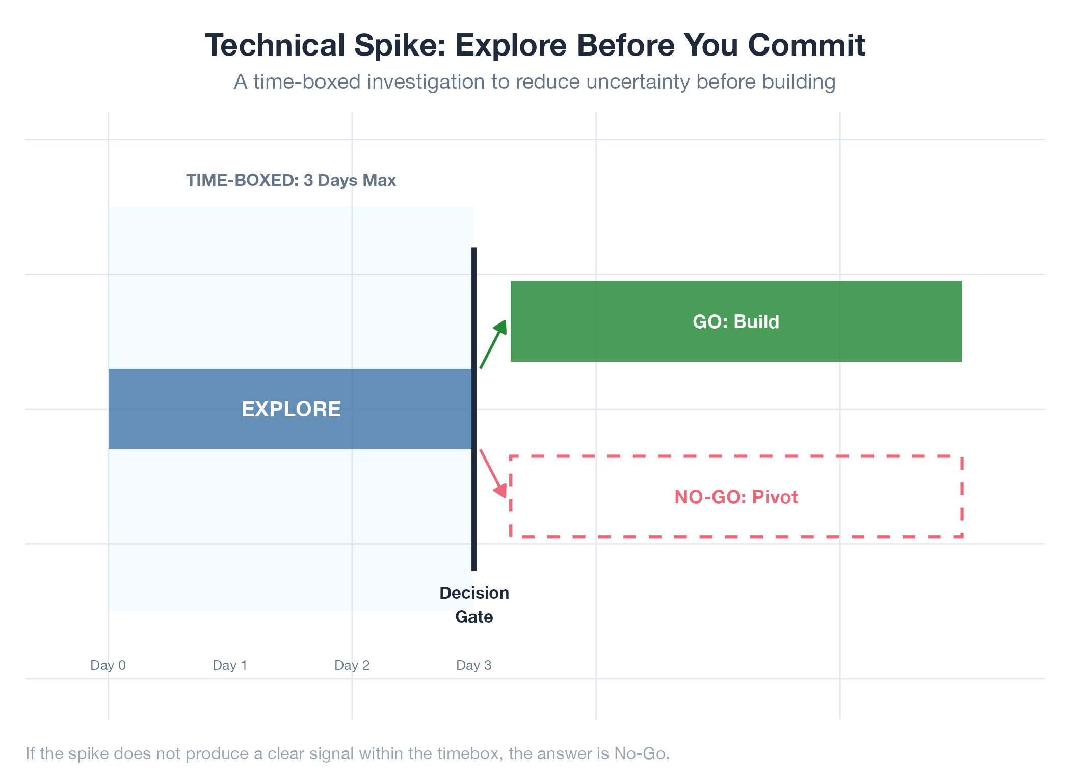 State the exact question → set a hard deadline → explore with the intent to discard → deliver a verdict. If the spike succeeds, rebuild properly. If it fails, redirect before burning weeks on a dead end.