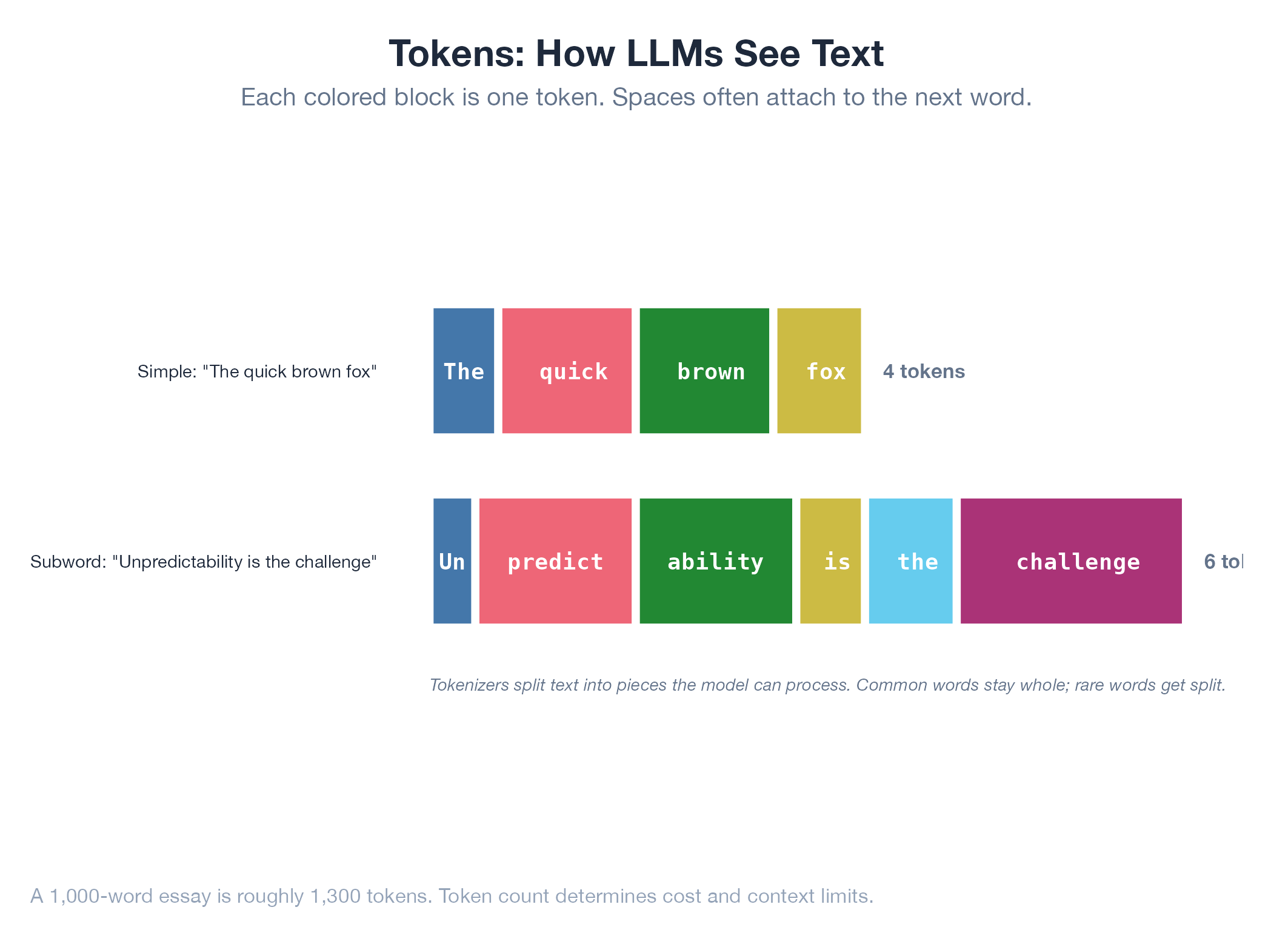 AI models don’t read text word by word : they break it into “tokens,” which are chunks that might be whole words, parts of words, or single characters. “Understanding” might become “under” + “standing.” “The” is one token. An unusual word might split into four. The model has a fixed vocabulary of 32,000–100,000 such pieces, and every input is built from them. Roughly 1 token ≈ 3/4 of an English word ≈ 4 characters. Tokens are why context windows are measured in token counts (128K, 1M) and why API pricing is per-token.