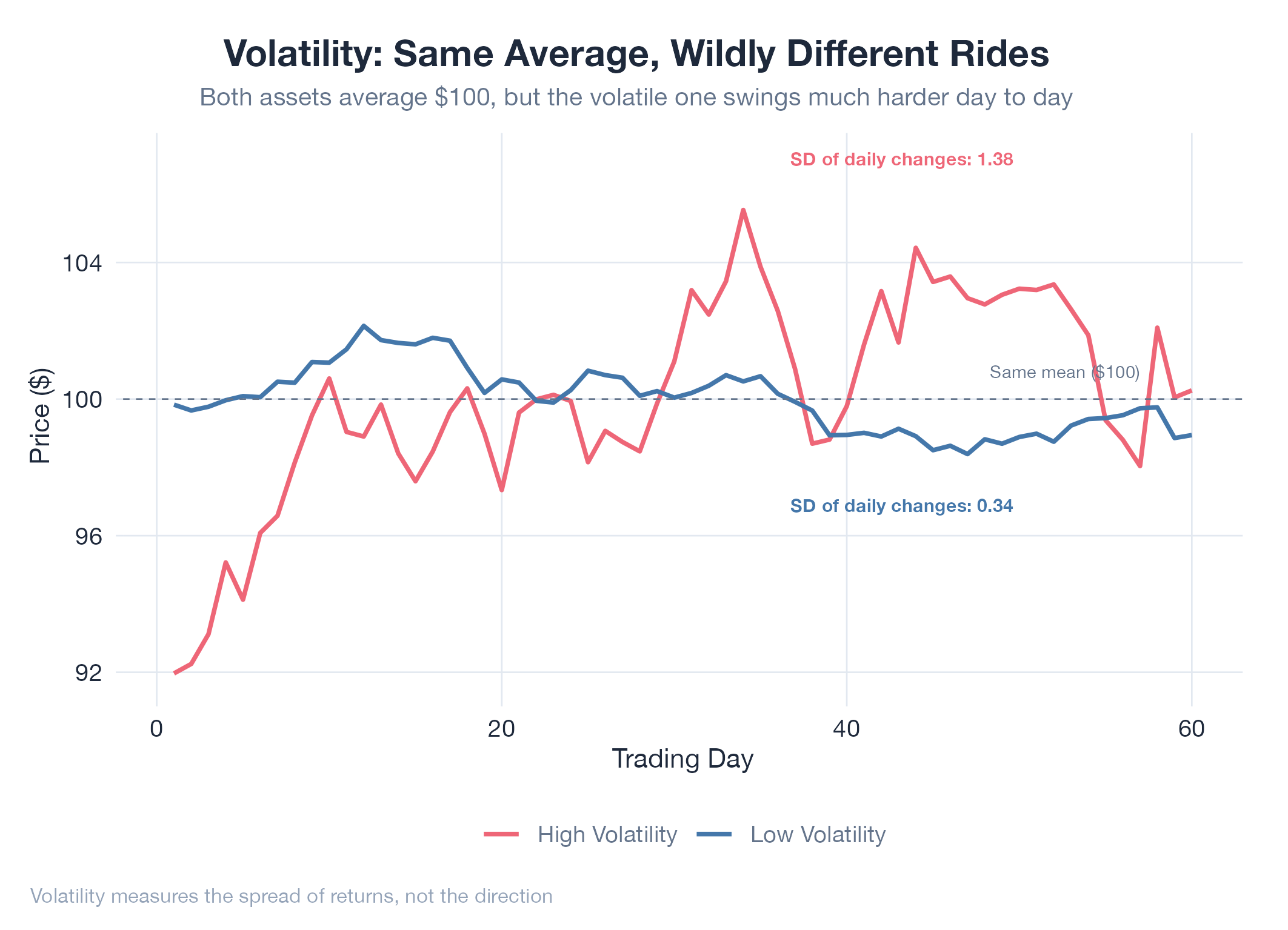 How much a price bounces around. High volatility means big swings, not just big losses.