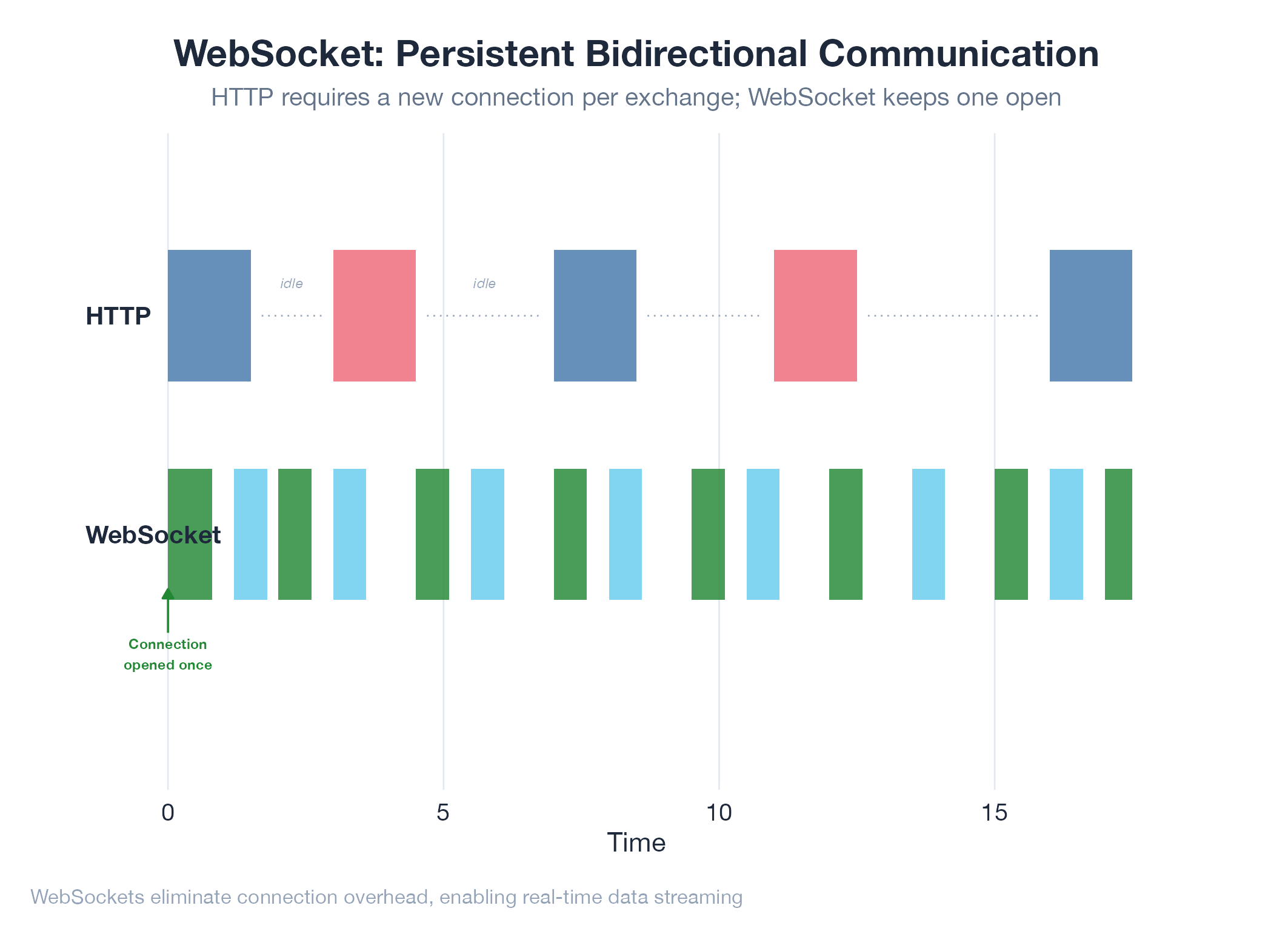 Client sends Upgrade: websocket header → server agrees → both sides exchange lightweight frames with no per-message overhead → either side closes gracefully when done. Full duplex vs HTTP’s request-then-response half-duplex.