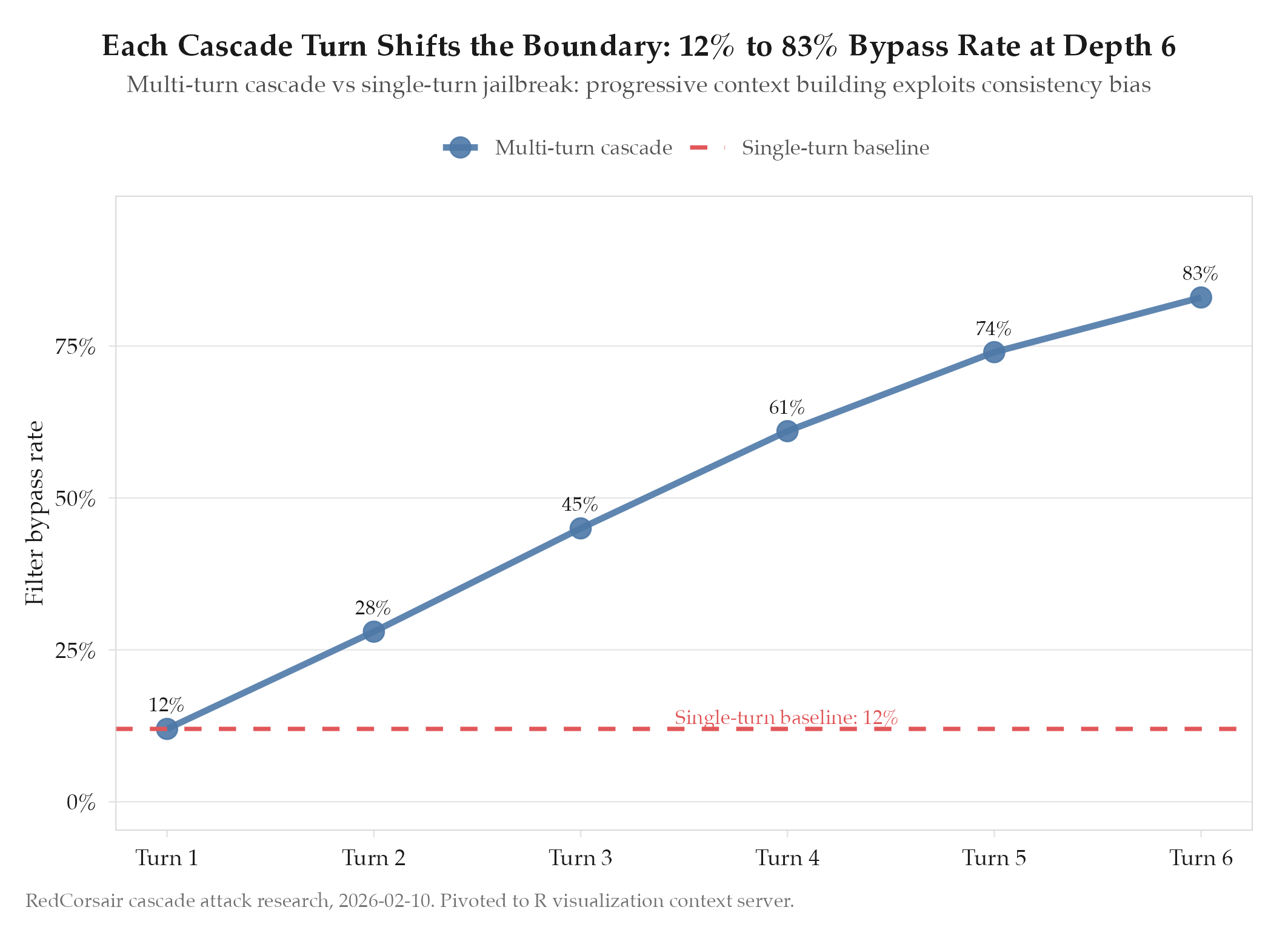 Multi-turn cascades bypass safety filters that block equivalent single-turn requests. The progressive context building c