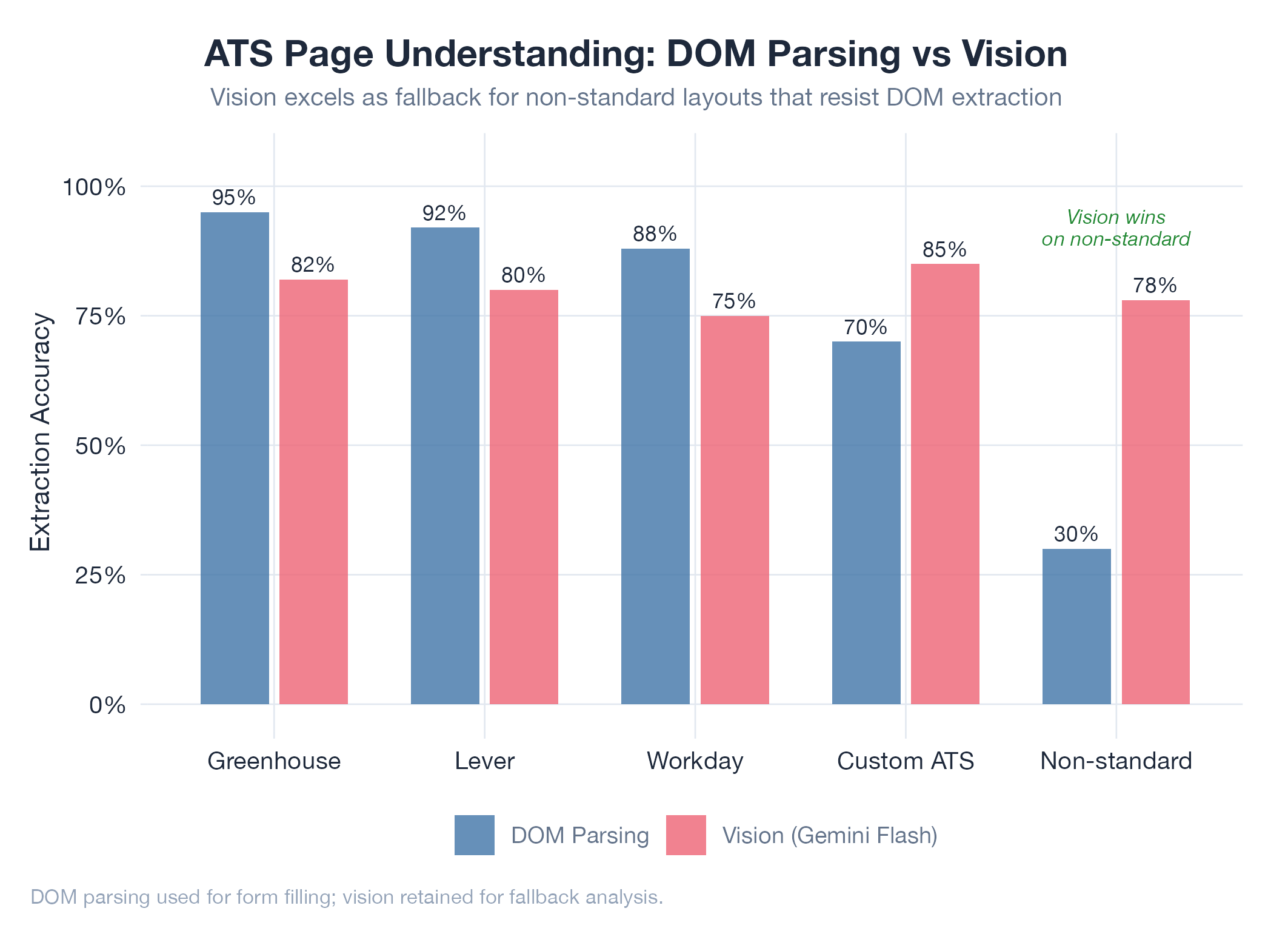 Vision approach worked for page understanding but was eventually replaced by DOM-based extraction for form filling. Visi