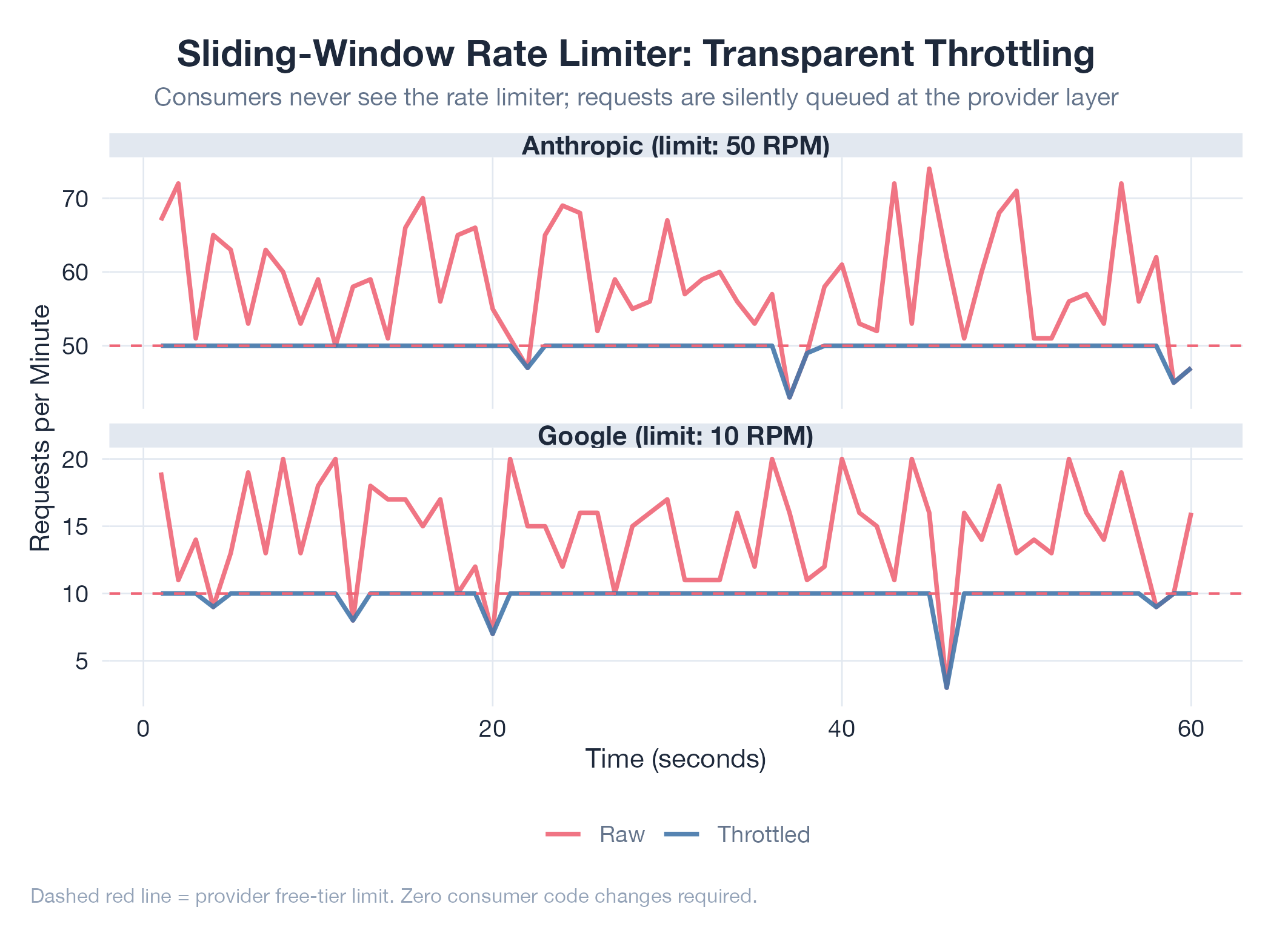 Zero consumer changes needed. Rate limiting invisible inside provider layer. Prevented cost blowouts during early develo