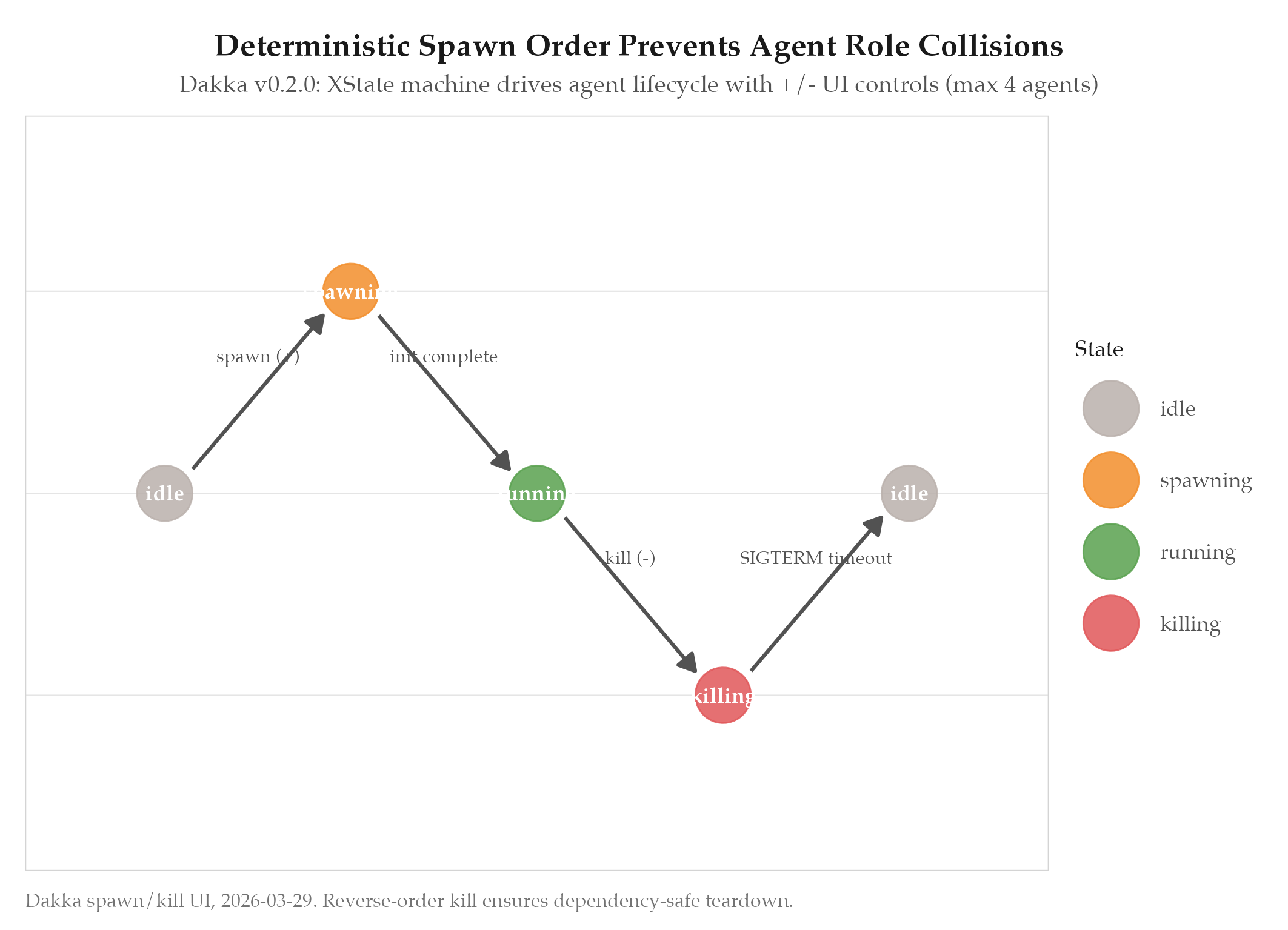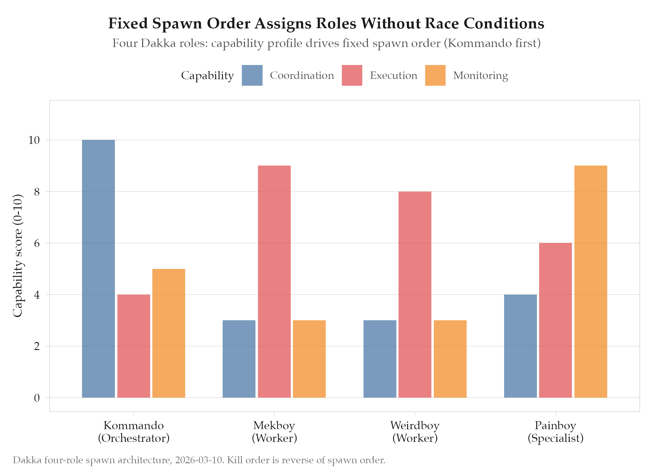 Fixed spawn order eliminates race conditions. Users can dynamically scale from 1-4 agents. Each role has distinct capabi