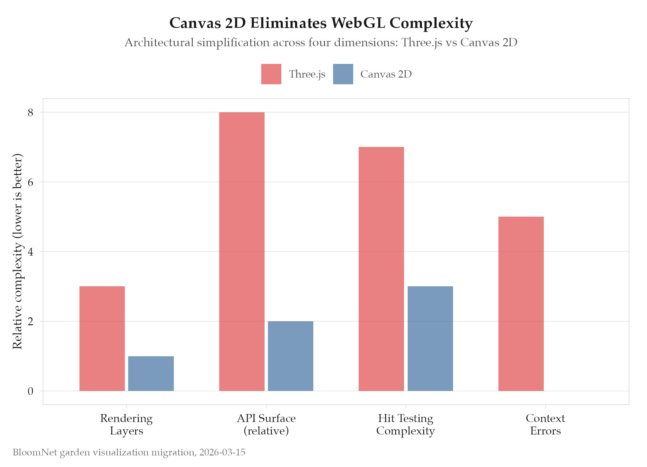 Canvas 2D eliminated WebGL context issues, simplified the rendering pipeline, and enabled L-system botanical encoding th
