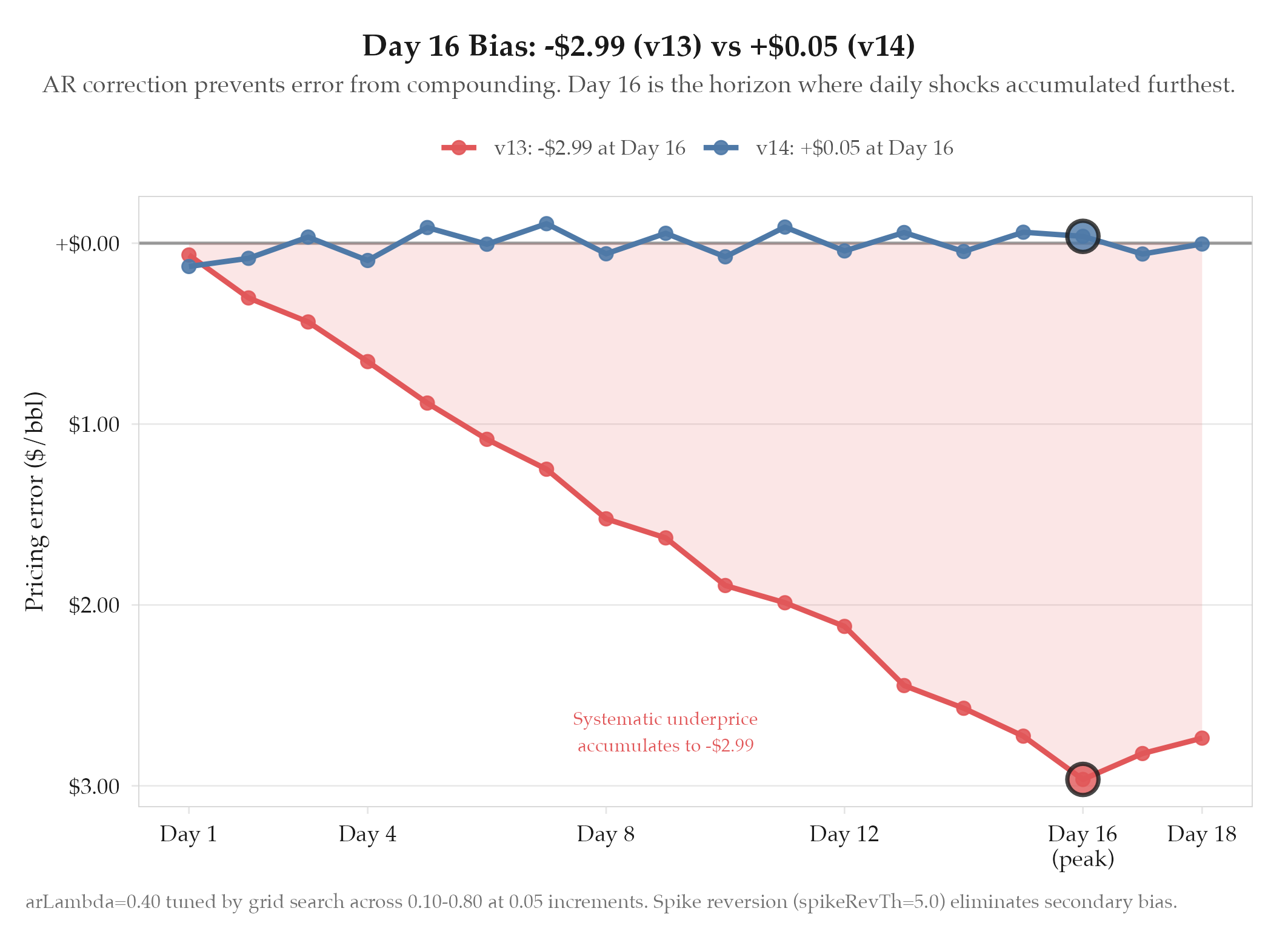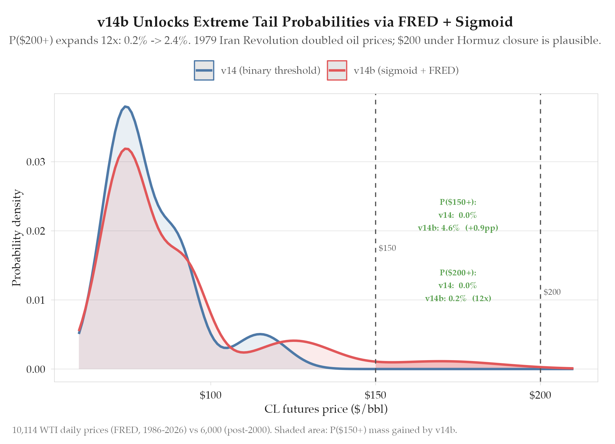 MAE $0.951 (42% improvement from v13's $1.633). Autocorrelation 0.1651→-0.001 (eliminated). OOS R² 0.9699. P($150) eleva