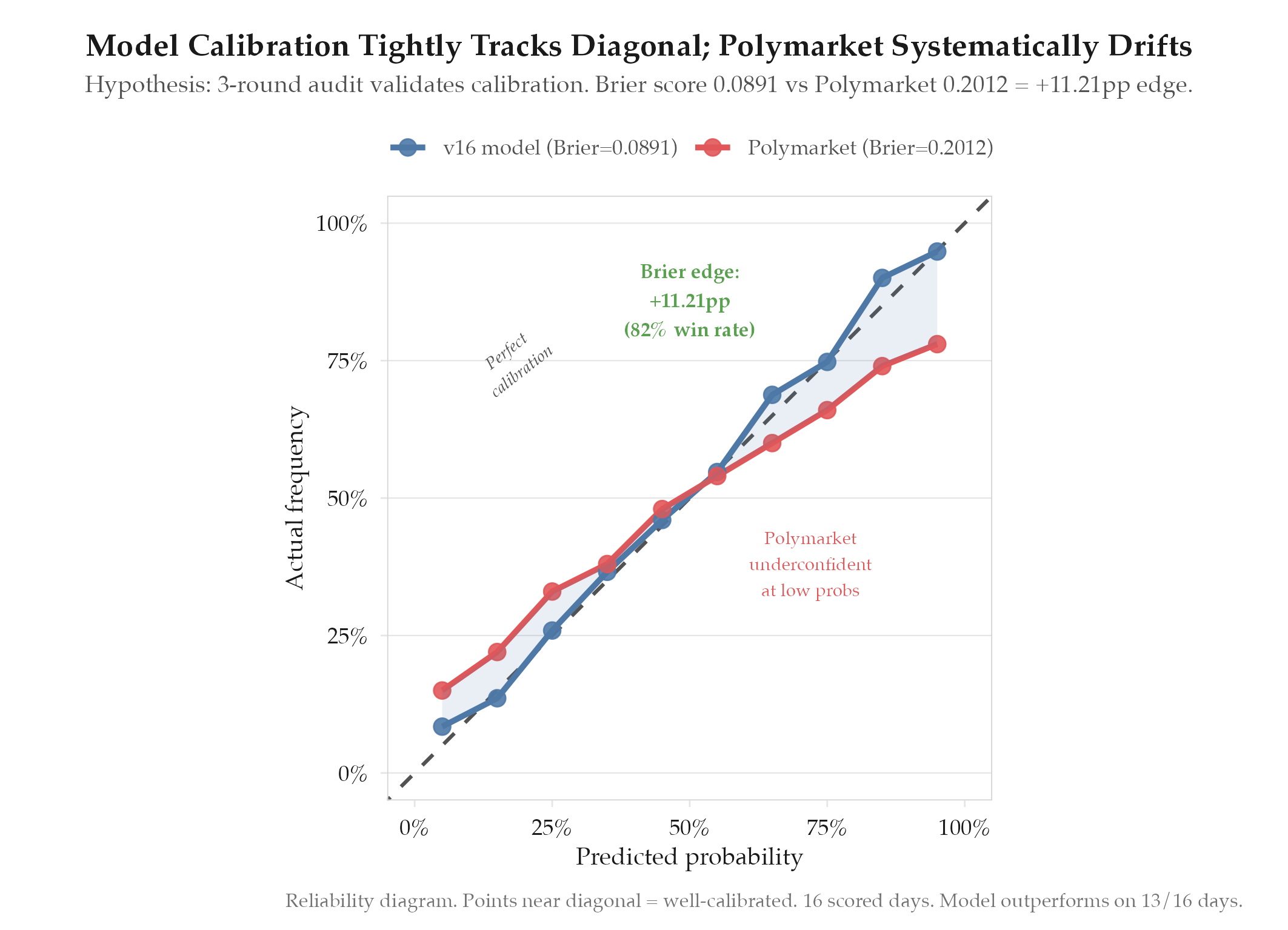 R² 0.9498→0.9616 (+1.18pp). MAPE 1.97%→1.89%. OOS R² 0.8633→0.9131 (+4.98pp). P($120+) 15.4%→36.4%. Historical pass rate