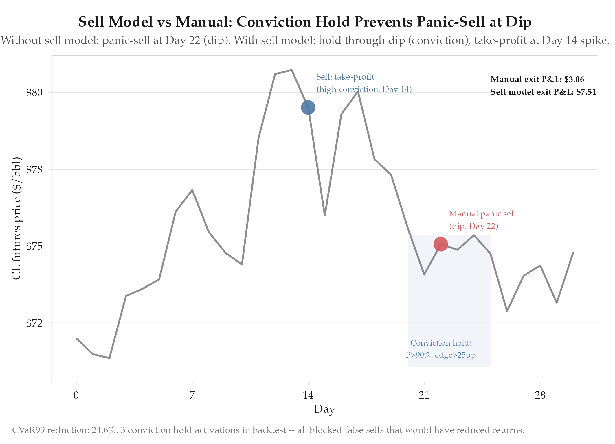Lowest one-step MAE: $0.833 (13% better than v14b). Direction accuracy 93.8% (15/16). Sell model: 100% trigger accuracy,