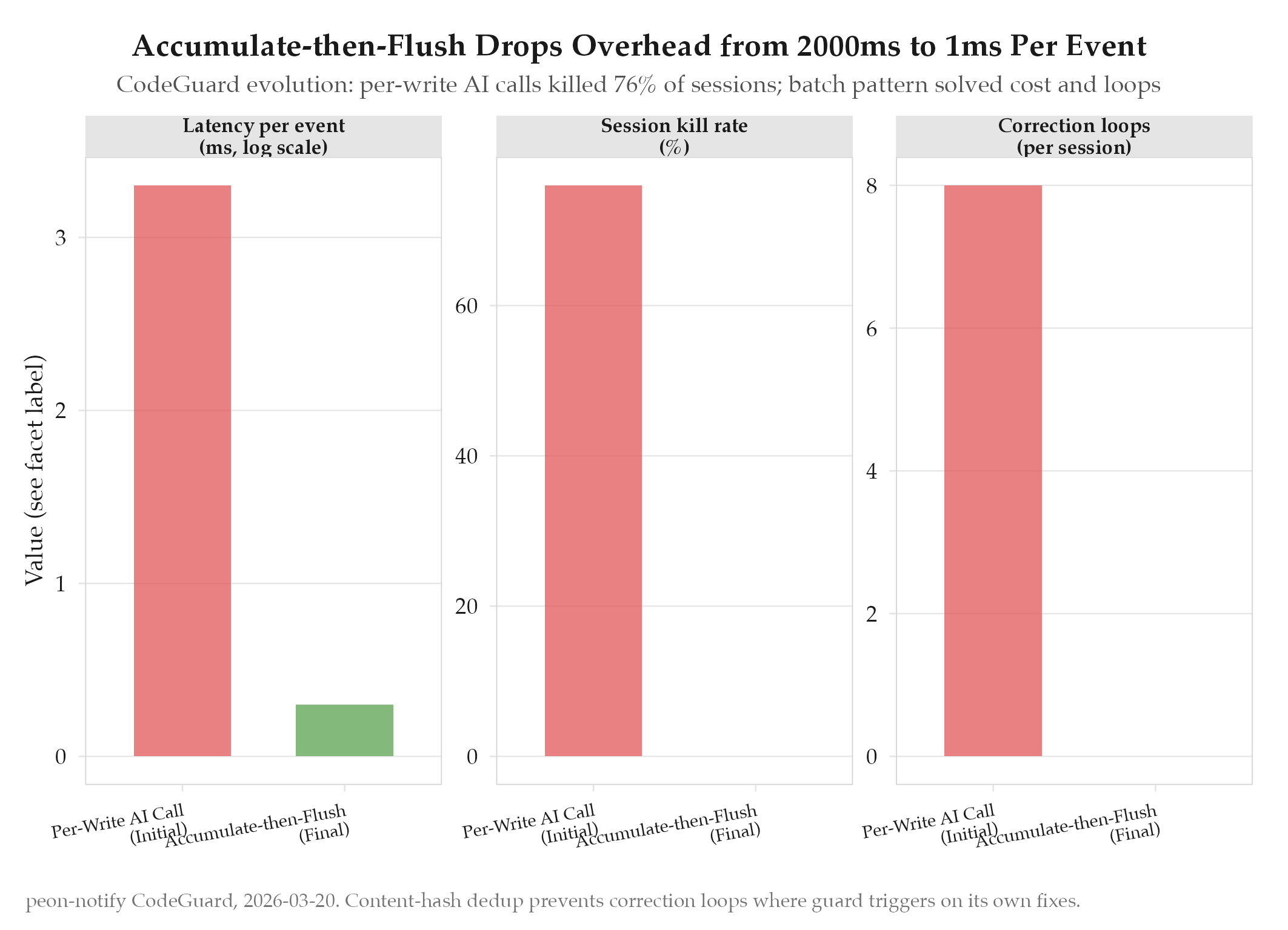 Per-write processing was too expensive (confirmed hypothesis partially wrong). Accumulate-then-flush pattern solved it: