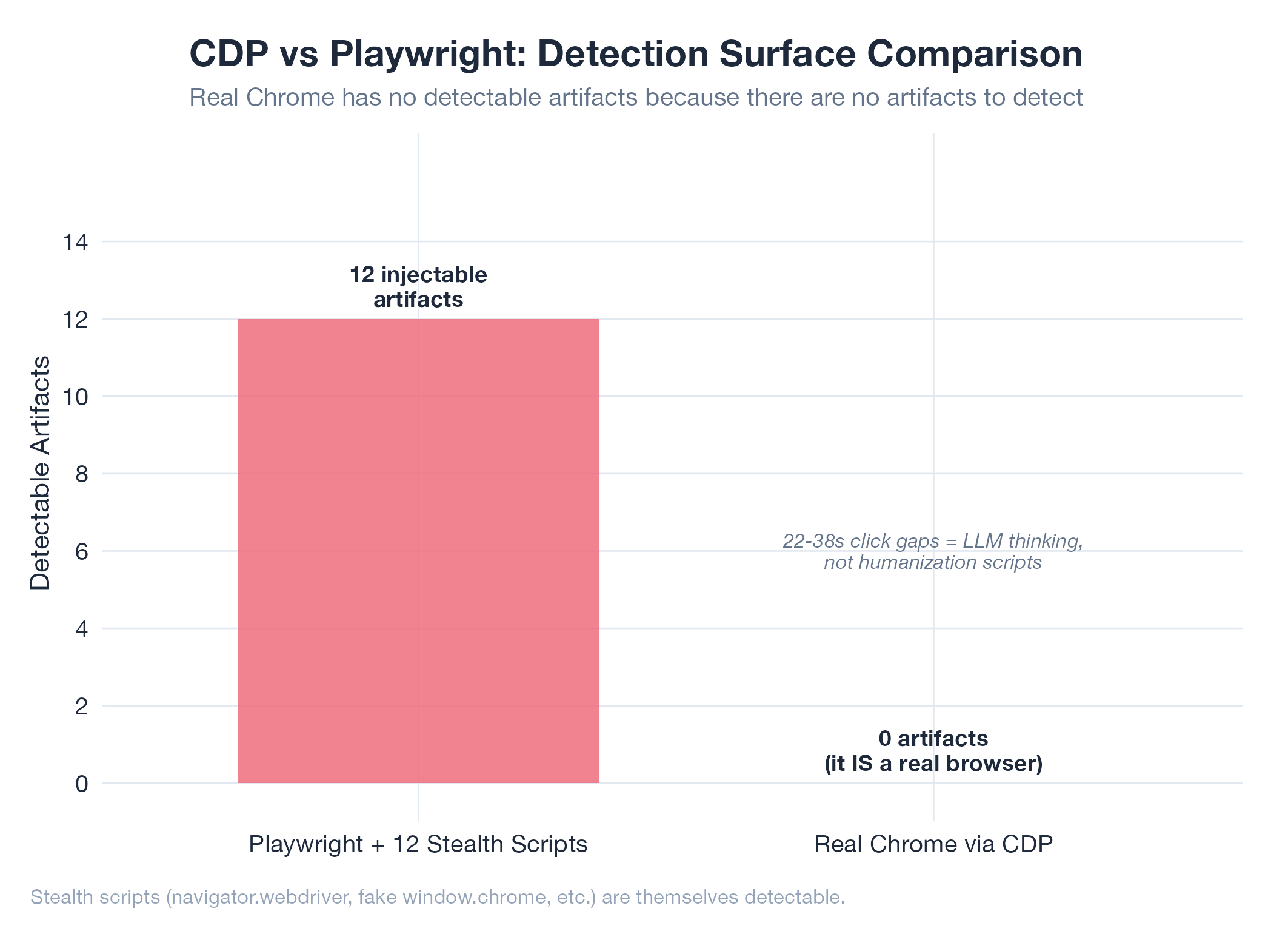 CDP mode disables ALL stealth scripts, relying entirely on real Chrome session. 22-38s click gaps were pure LLM inferenc