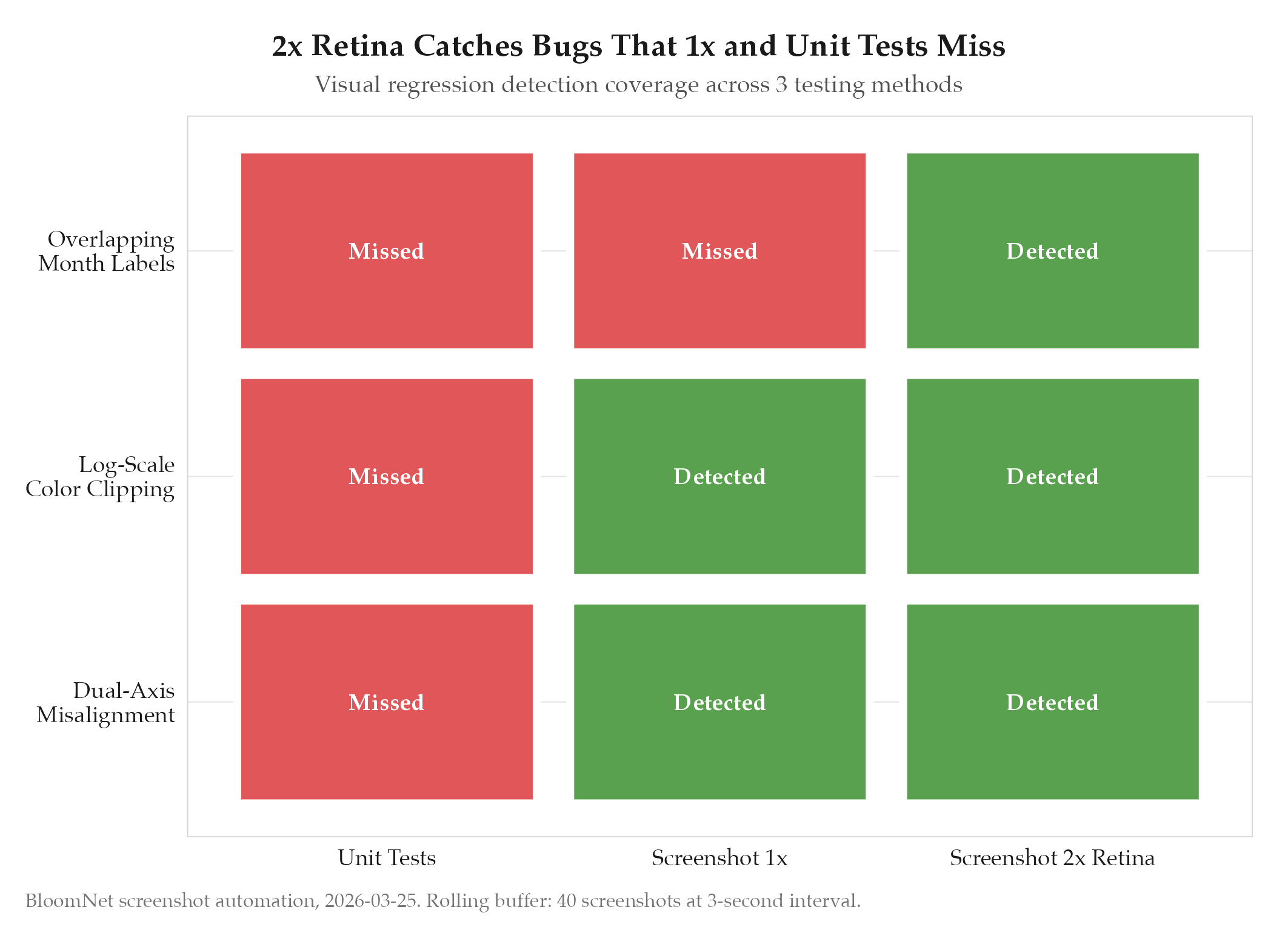 Screenshot automation catches rendering bugs that unit tests miss. 2x retina resolution reveals sub-pixel issues. Rollin