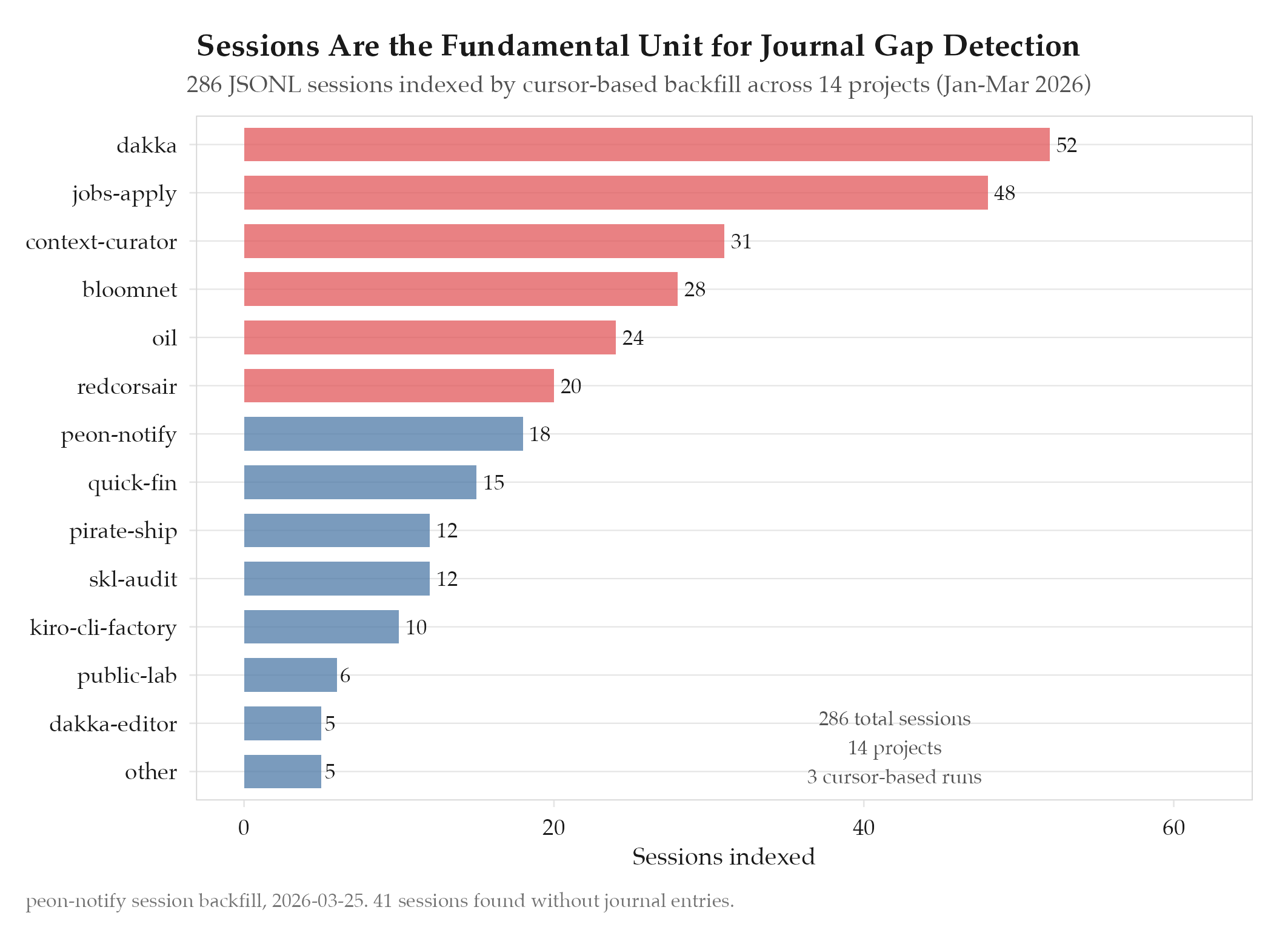 286 sessions indexed from JSONL backfill. Cursor-based processing enables incremental updates without reprocessing. Sess