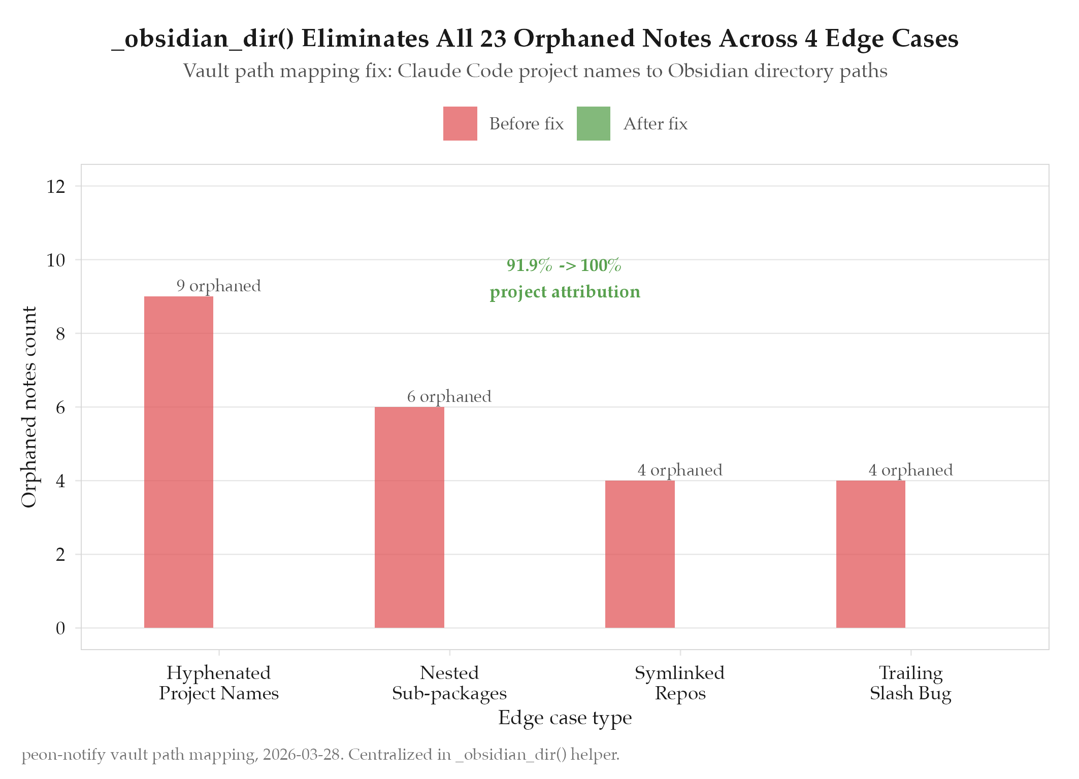Orphaned notes eliminated. All session-generated notes now land in correct vault directories. The _obsidian_dir() mappin