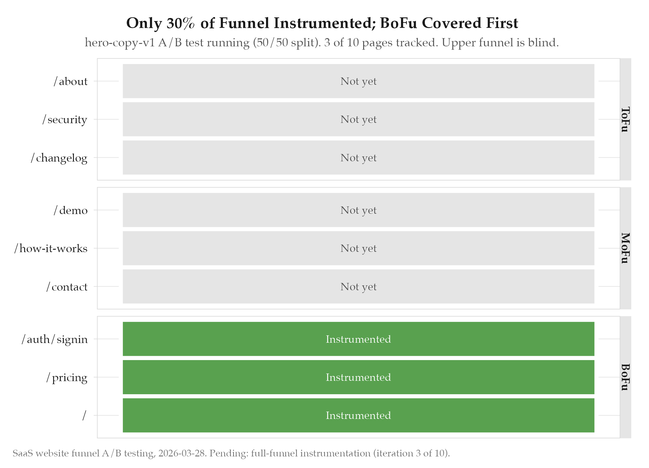 Experiment running. Only 3/10 pages instrumented (30%). Planned: 10 iterations covering CTA variants, flow tracking, dem
