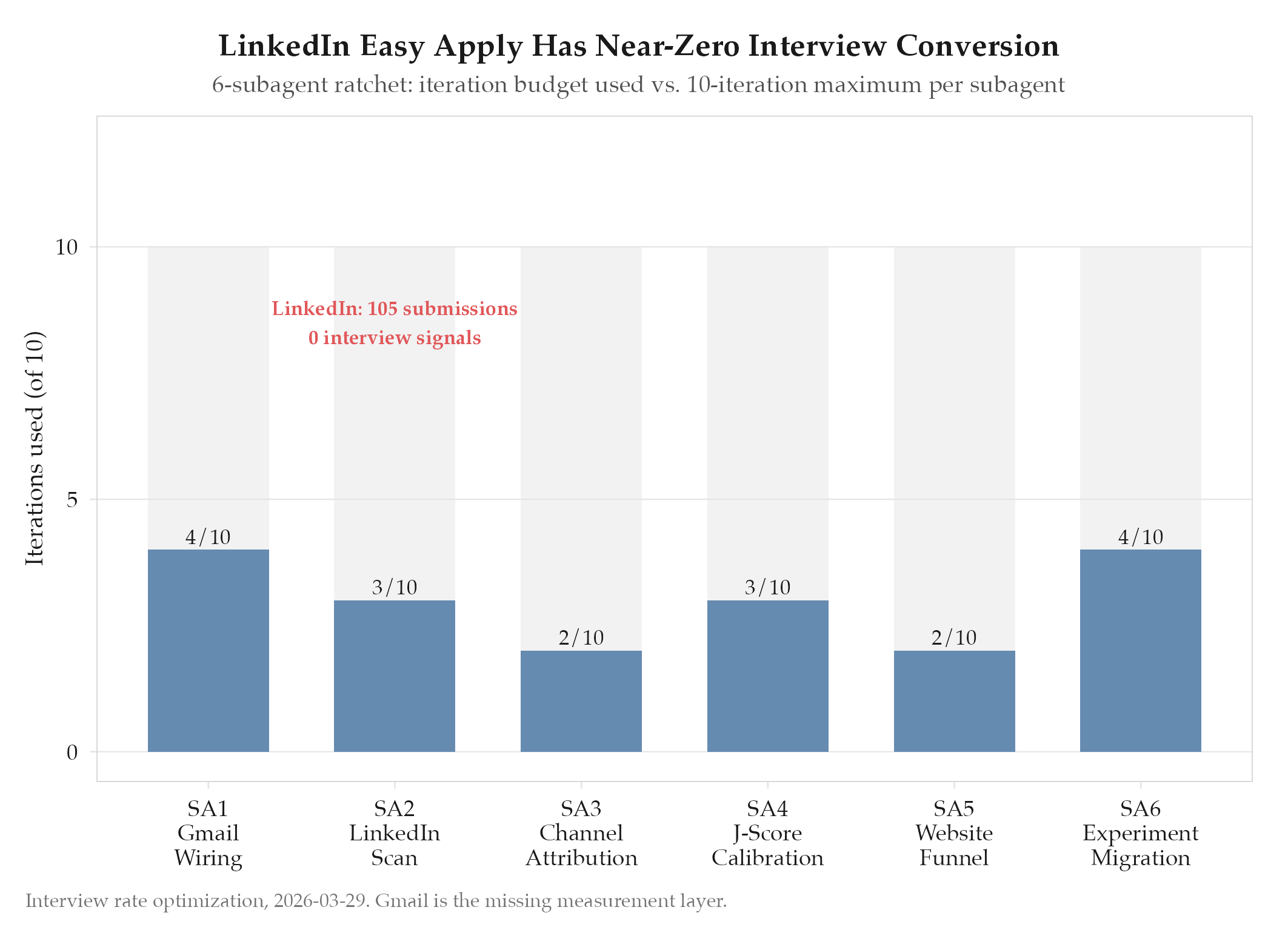 All 6 subagents complete. LinkedIn scan revealed 0 interview signals from 105 submitted applications. All 12 recruiter m