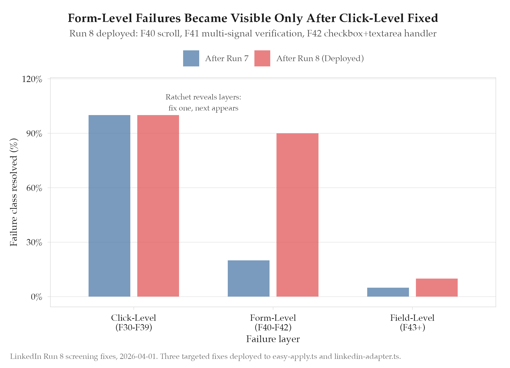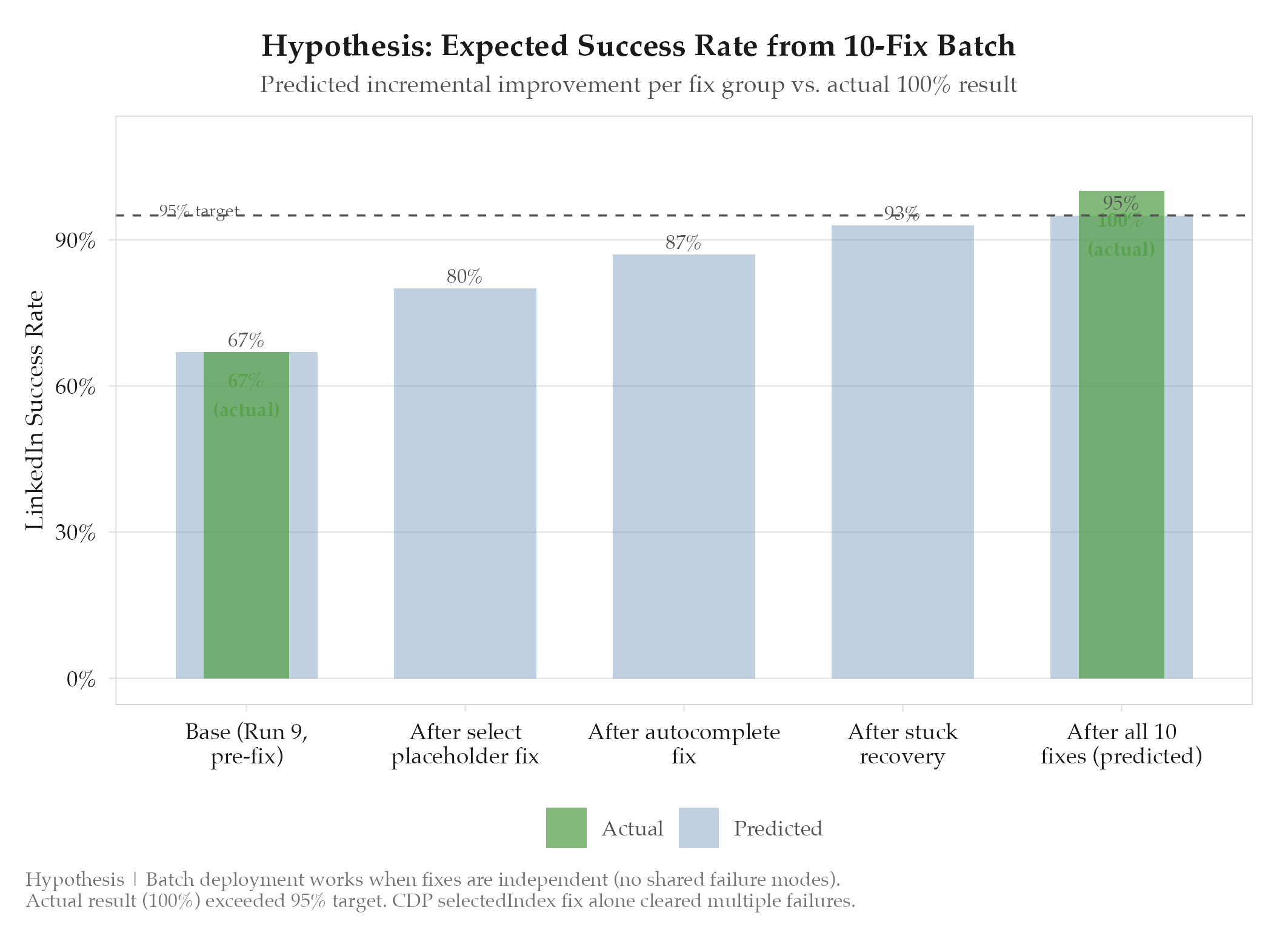 6/6 = 100% after select fix deployed. 9/13 total for the day (3/7 before fixes, 6/6 after). From Run 1 (40%) to Run 10 (