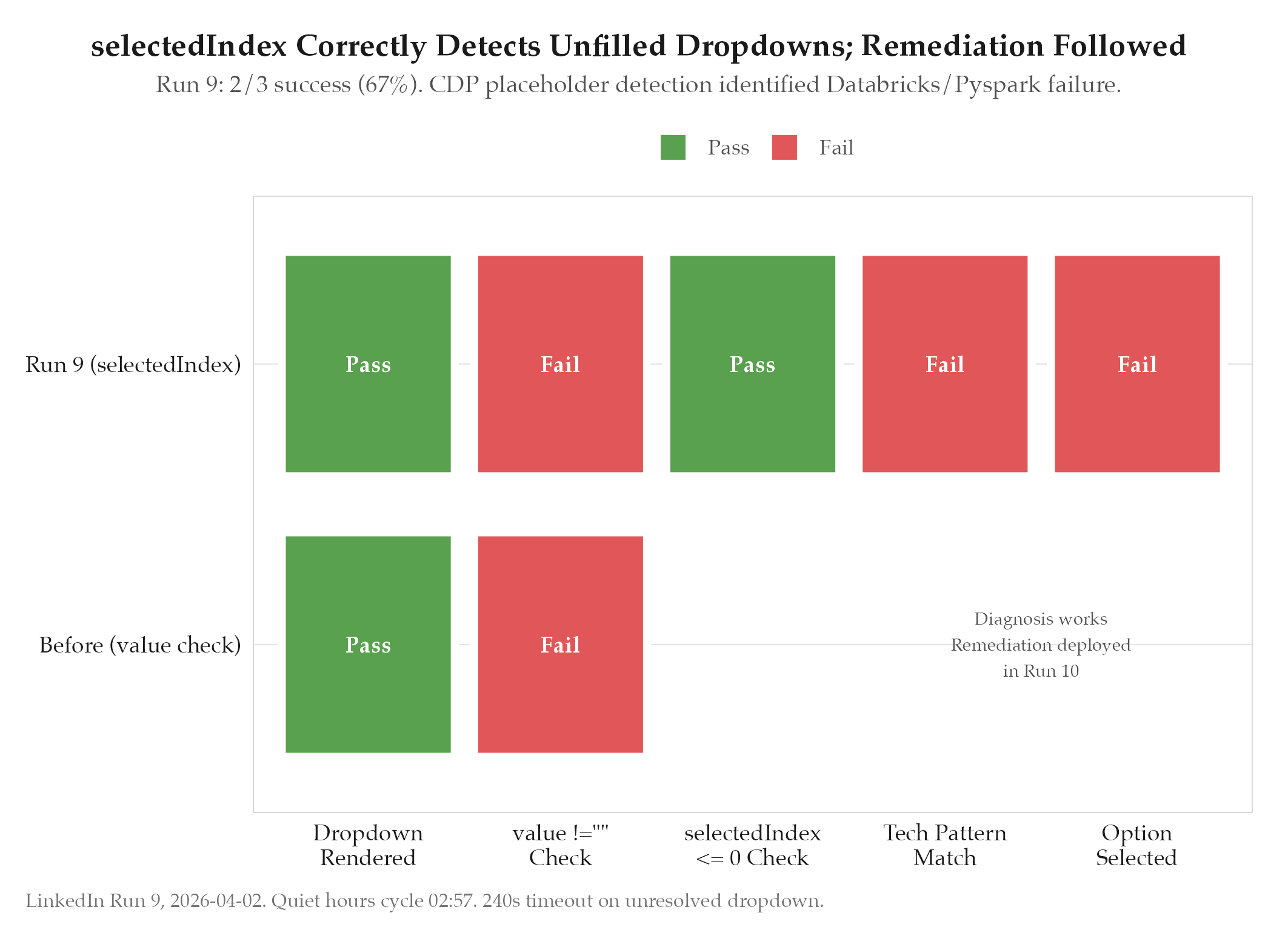 2/3 = 67% during quiet hours. 1 failure: 240s timeout on screening question dropdown (Databricks/Pyspark). CDP select de