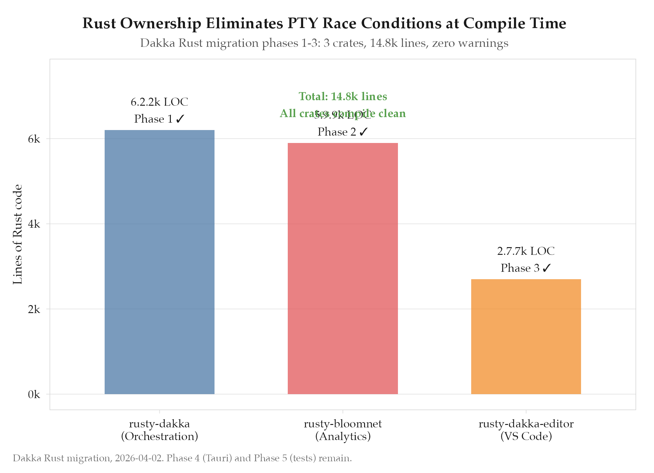 14.8k total lines of Rust. All 3 crates compile clean. Ownership model eliminates PTY race conditions by design. Phase 4