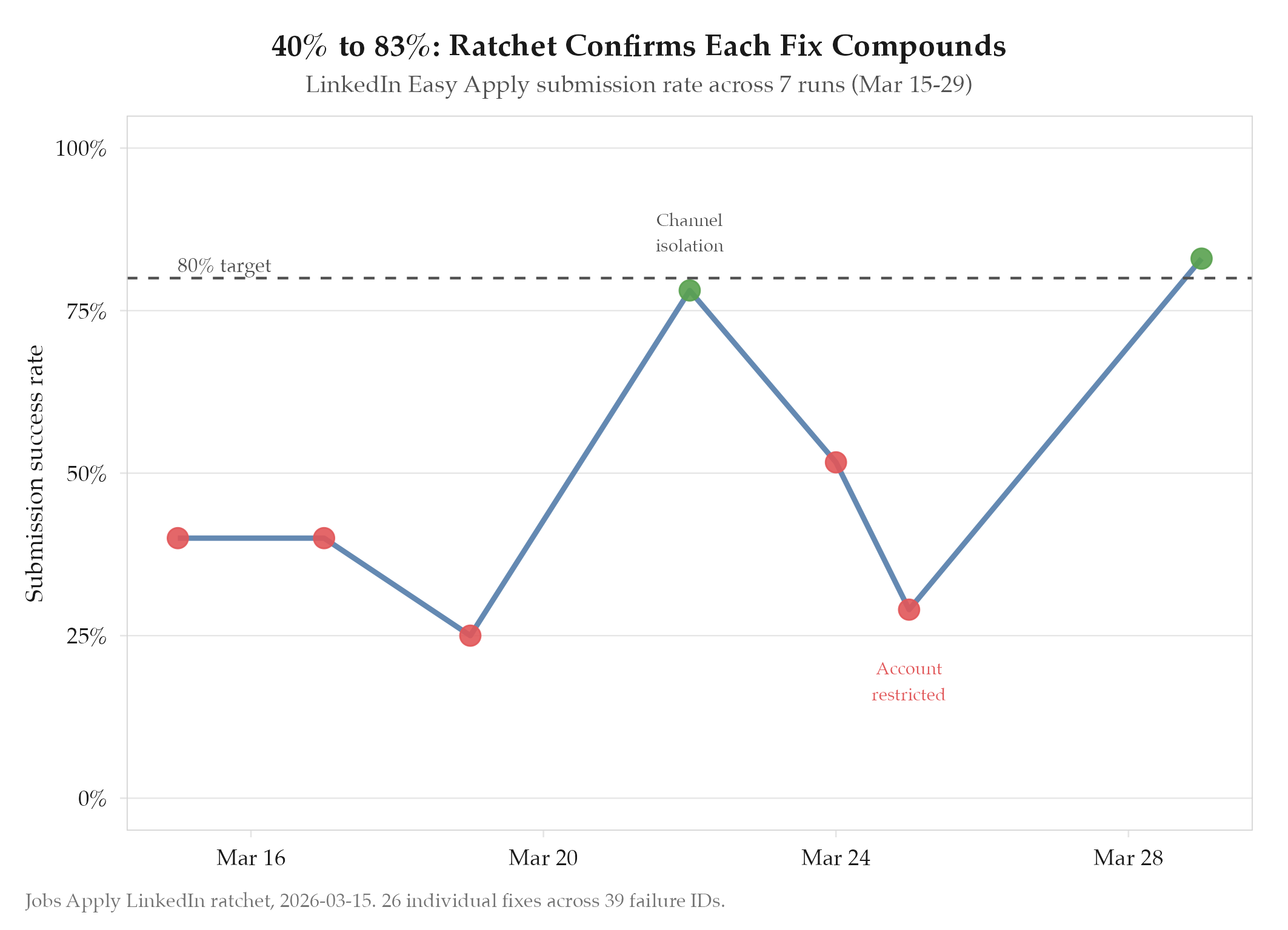 Systematic fix of individual failure points will drive LinkedIn Easy Apply submission rate above 80%. The LinkedIn Easy Apply flow involves multiple DOM interactions (clicking Apply, navigating multi-step modals, uploading resumes, answering screening questions, and submitting): each of which can fail independently. By identifying and fixing failures one at a time in a ratchet pattern, the compound success rate should climb monotonically.