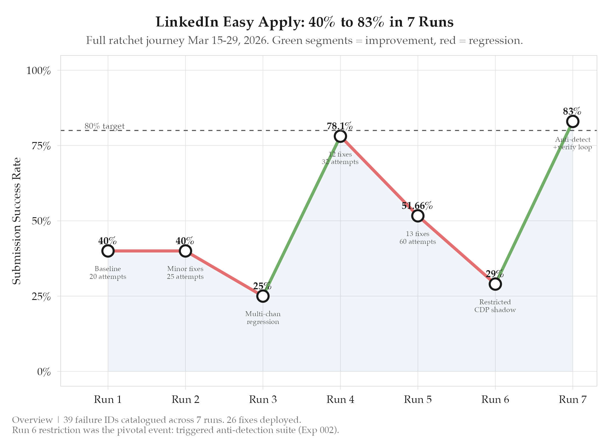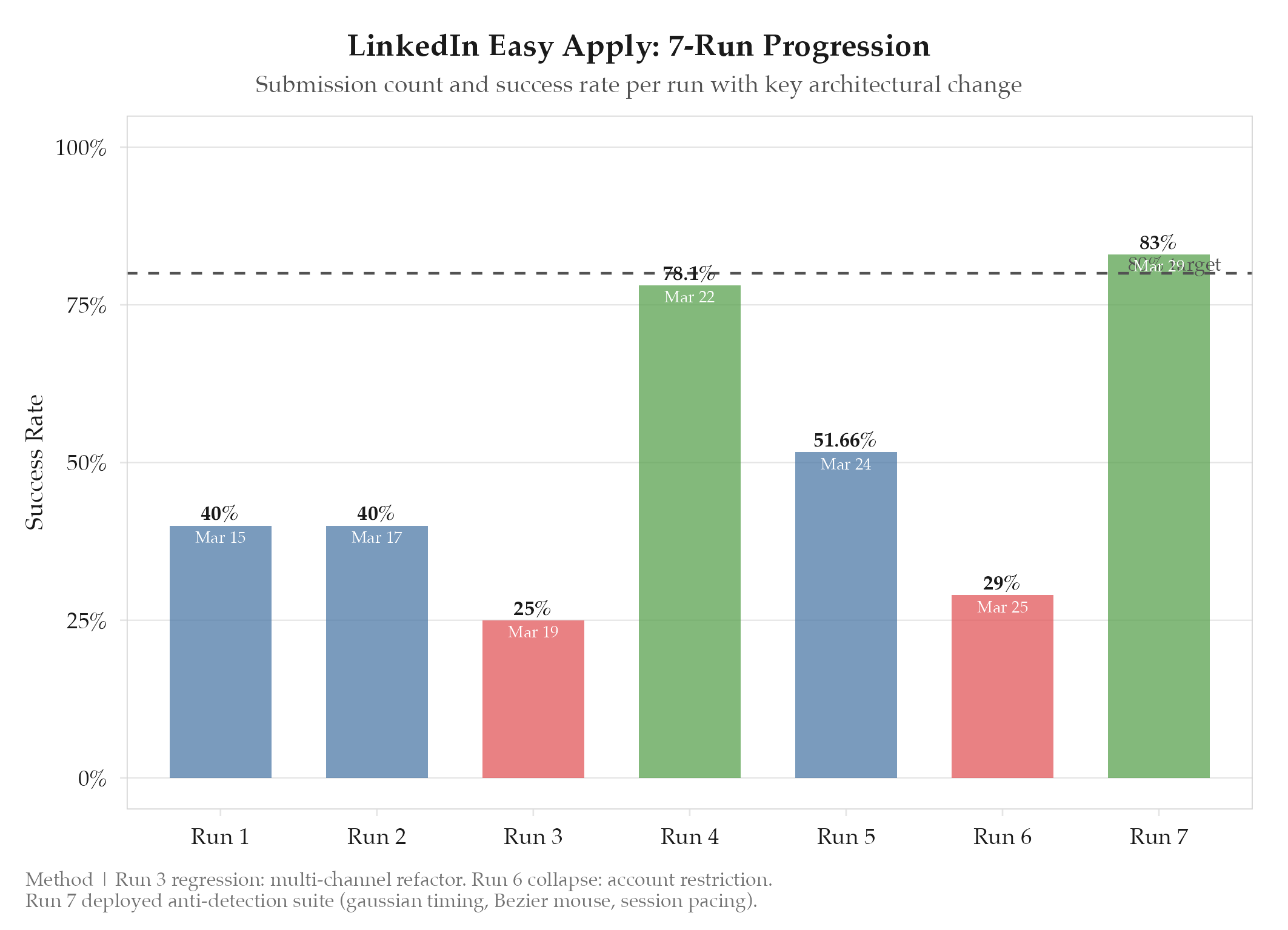 Seven runs were executed over March 15-29, 2026. Each run consisted of a batch of Easy Apply submissions with all failures logged and categorized. Between runs, targeted fixes were deployed for the highest-frequency failure modes.
