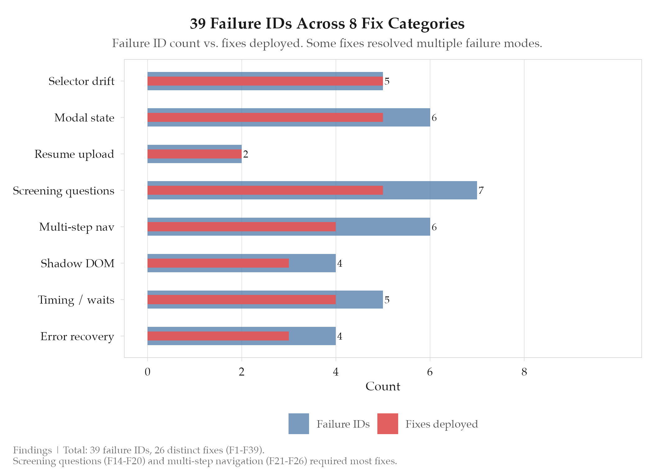 Fix categories (F1-F39): Selector drift (F1-F5), modal state detection (F6-F11), resume upload race conditions (F12-F13), screening question parsing (F14-F20), multi-step navigation (F21-F26), shadow DOM traversal (F27-F30), timing and wait conditions (F31-F35), error recovery (F36-F39).