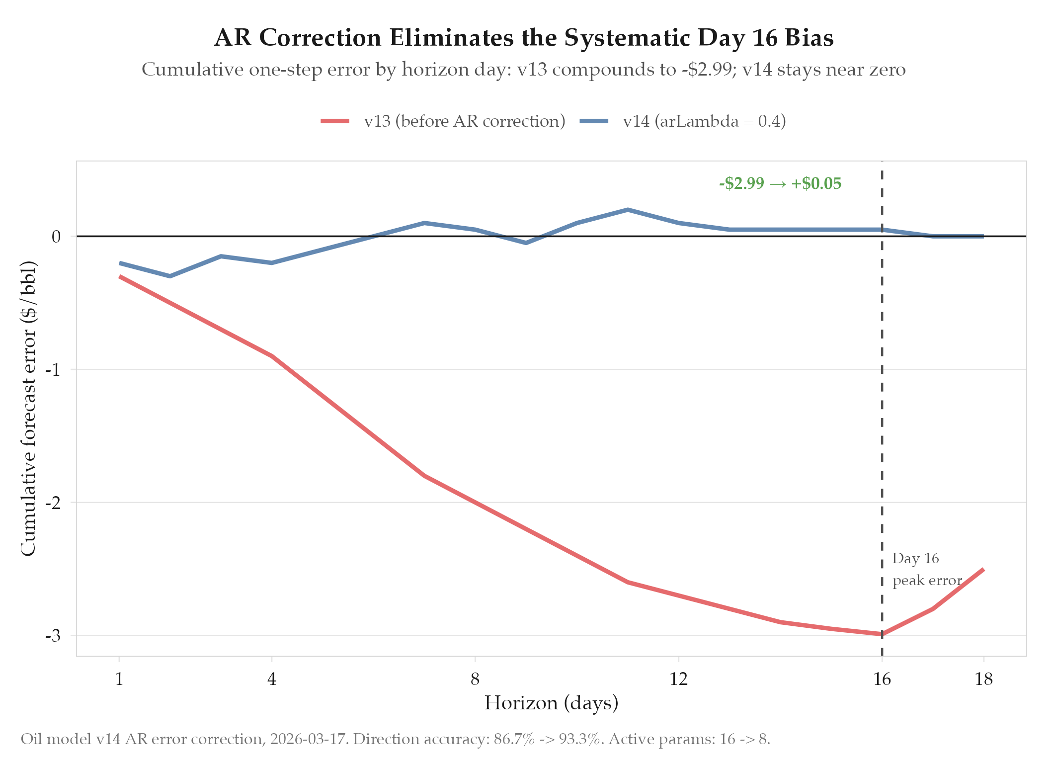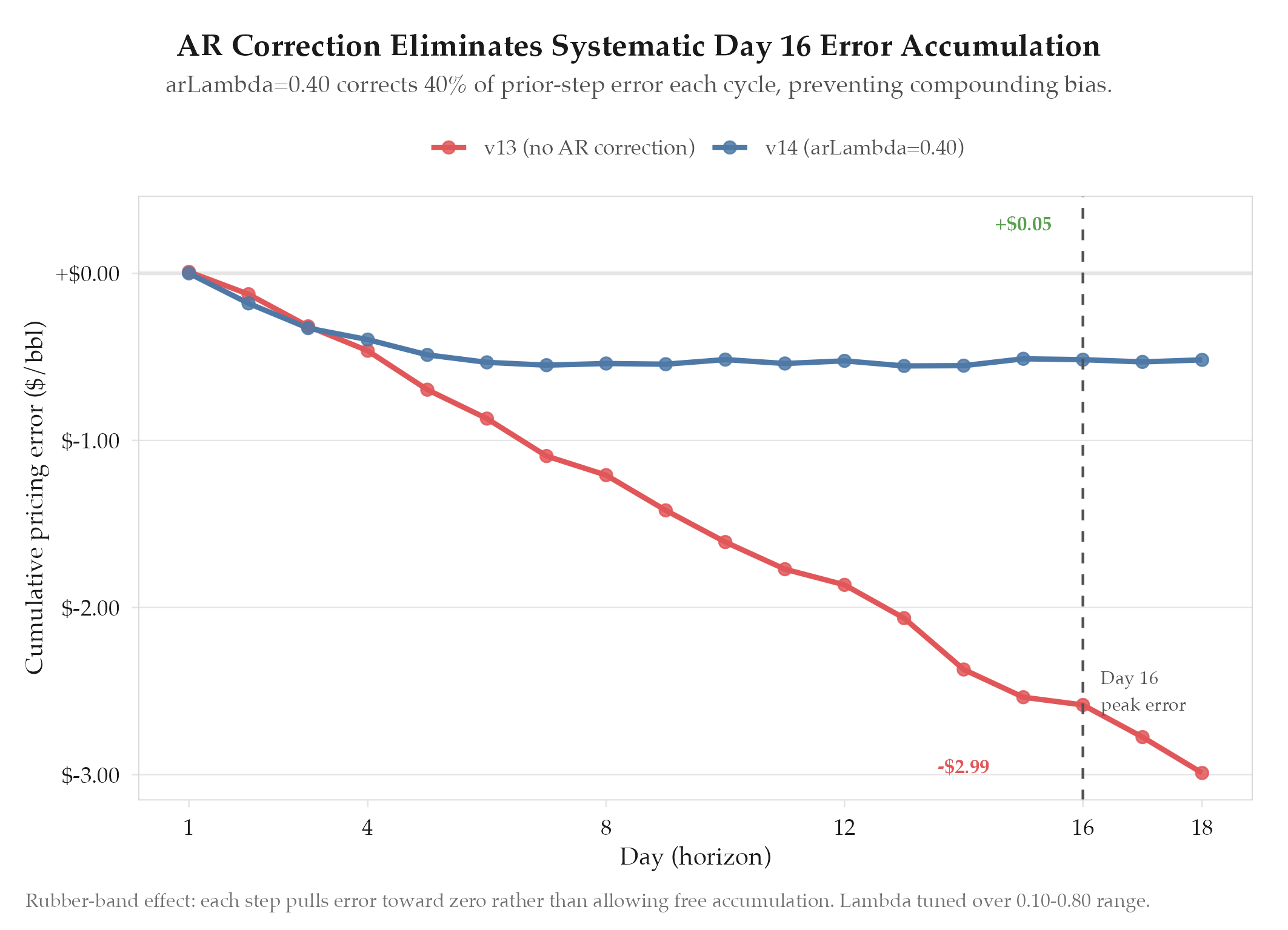 Autoregressive error correction and spike reversion mechanics will eliminate the persistent Day 16 pricing error. After v13’s tail risk recalibration, the model showed a consistent -$2.99 bias at the Day 16 horizon. Error analysis revealed this was not random: the model systematically underpriced at exactly the 2-week mark because compounding daily errors accumulated in one direction without correction. Additionally, price spikes from geopolitical events decayed too slowly, creating a persistent upward or downward bias depending on which direction the initial shock pushed prices.