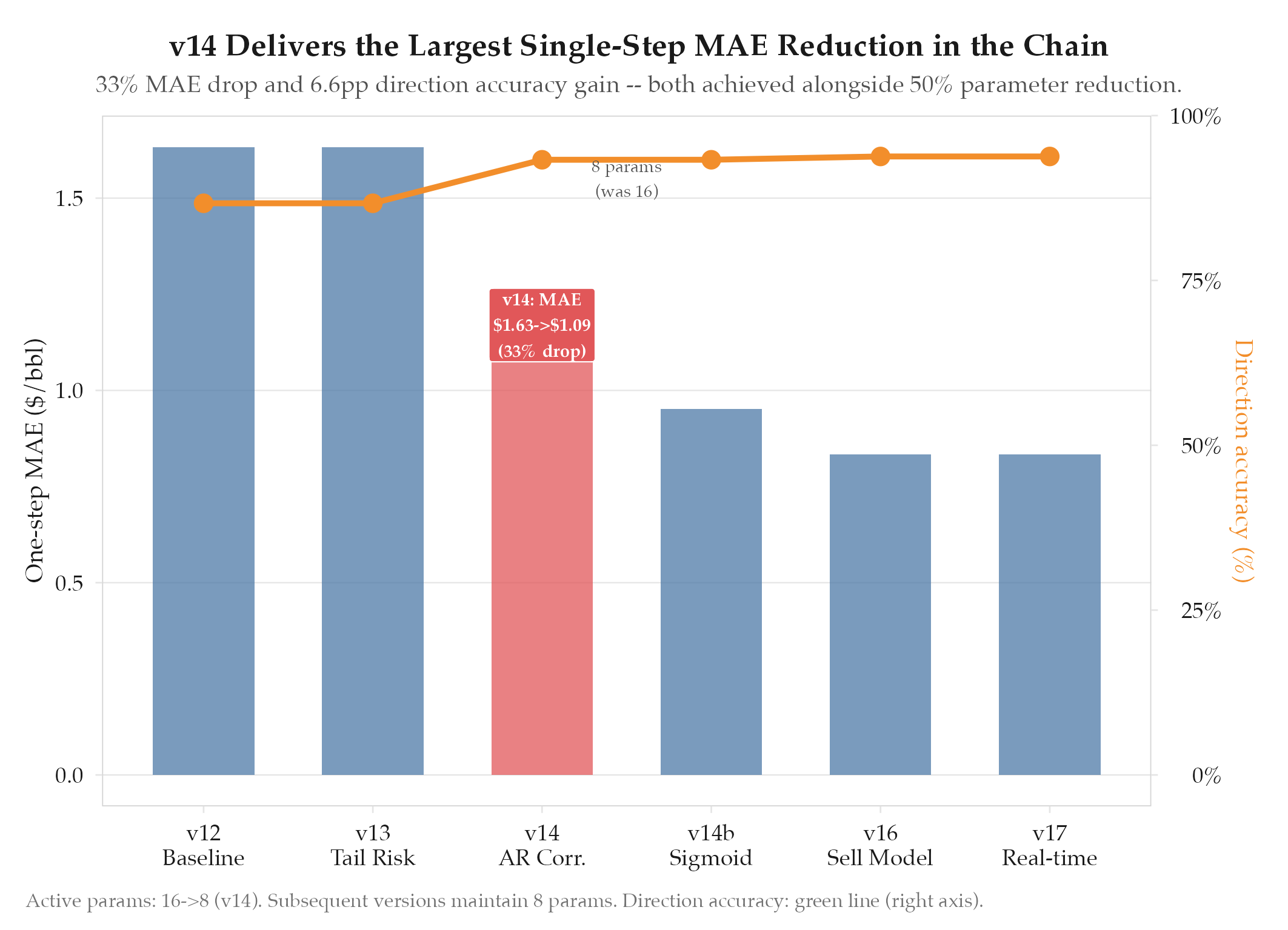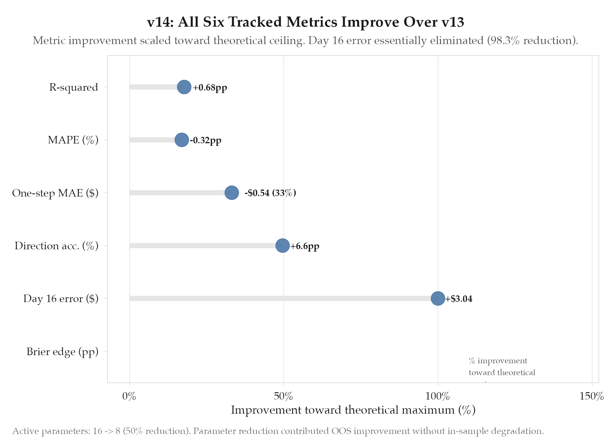 R² 0.9684 (+0.68pp). MAPE 1.57% (-0.32pp). One-step MAE $1.09 (-$0.54, 33% improvement). Direction accuracy 86.7%→93.3% (+6.6pp). Day 16 error -2.99→+0.05 (essentially eliminated, +$3.04). Brier +4.14pp. Active params reduced to 8.