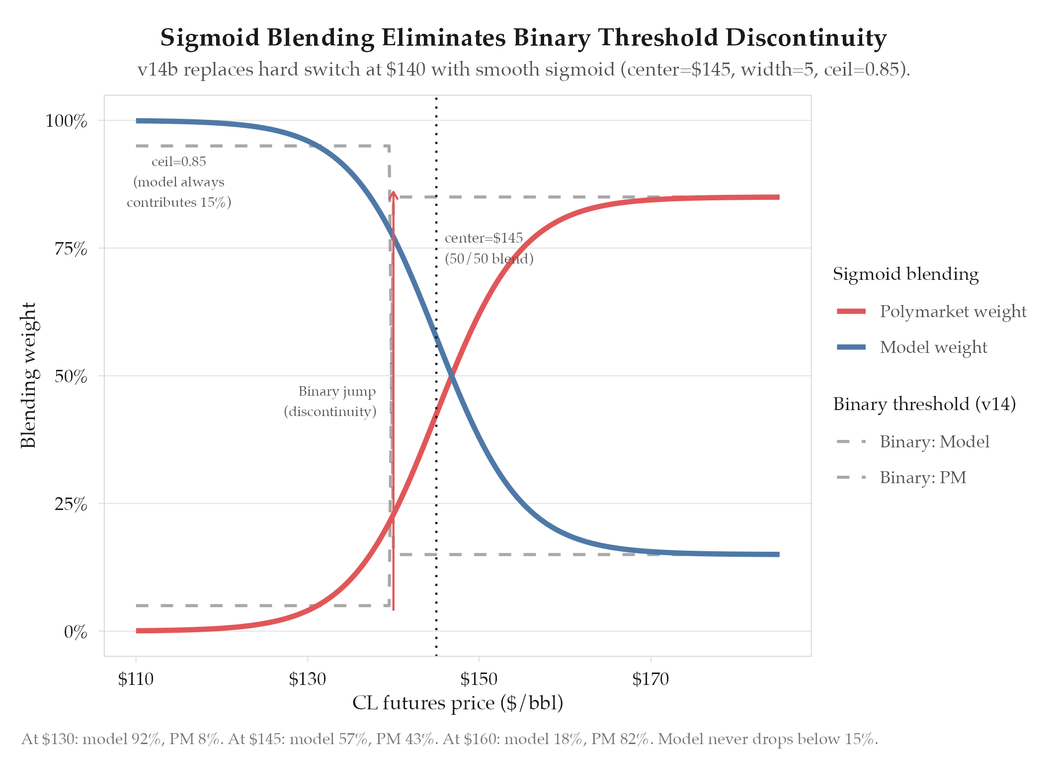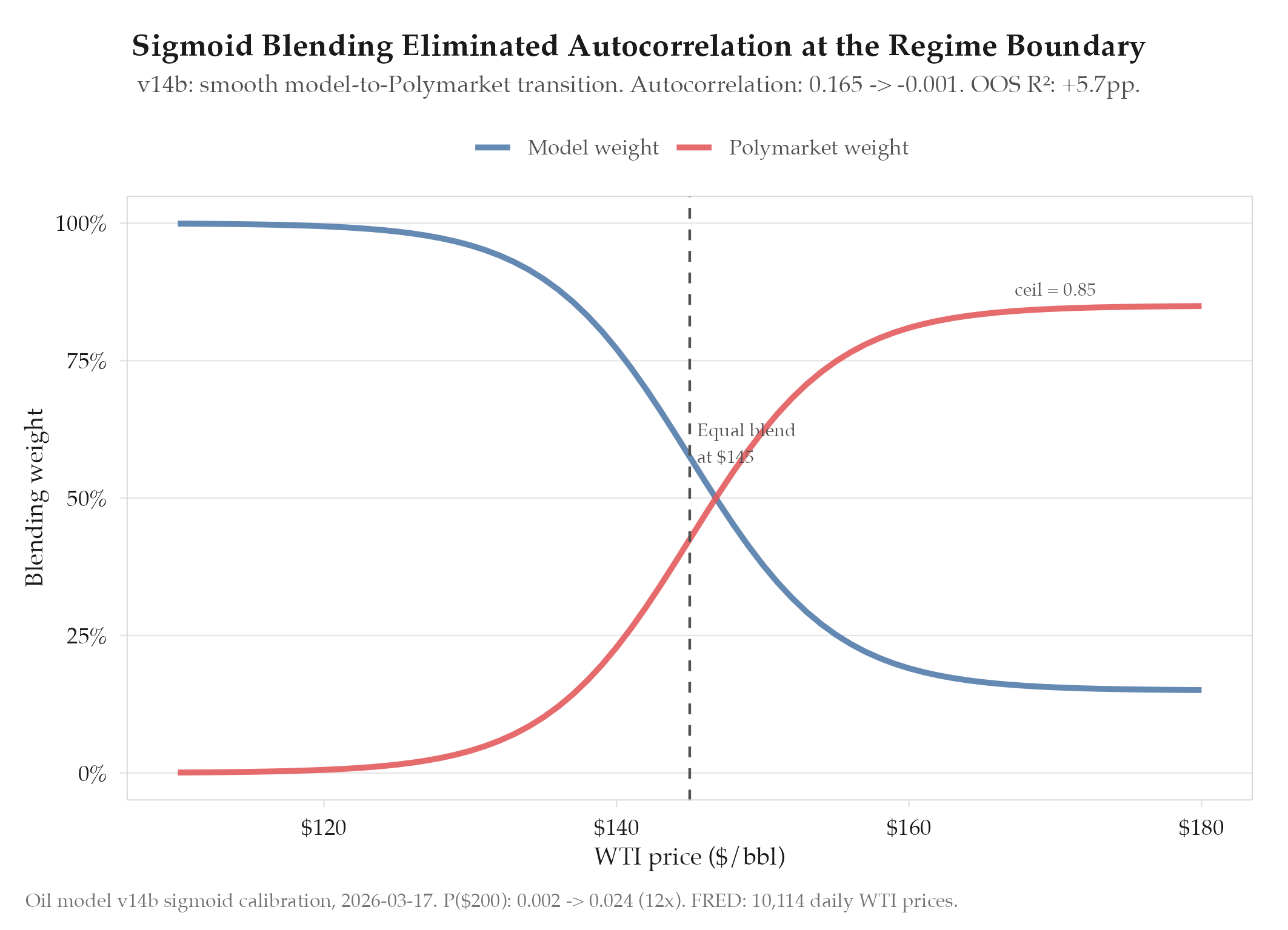 Sigmoid probability blending (vs binary threshold) combined with expanded historical validation (10K WTI prices) will eliminate autocorrelation and improve tail calibration. The v14 model blended its own probability estimates with Polymarket odds using a hard threshold: below $X the model dominated, above $X Polymarket dominated. This created visible discontinuities in the probability surface and left residual autocorrelation of 0.1651 in the error series (errors on consecutive days were correlated, suggesting the model was systematically slow to adjust). Additionally, the model had only been validated against post-2000 WTI data (~6,000 prices), missing the volatile 1986-2000 period that includes the Gulf War I spike and the 1998 collapse.