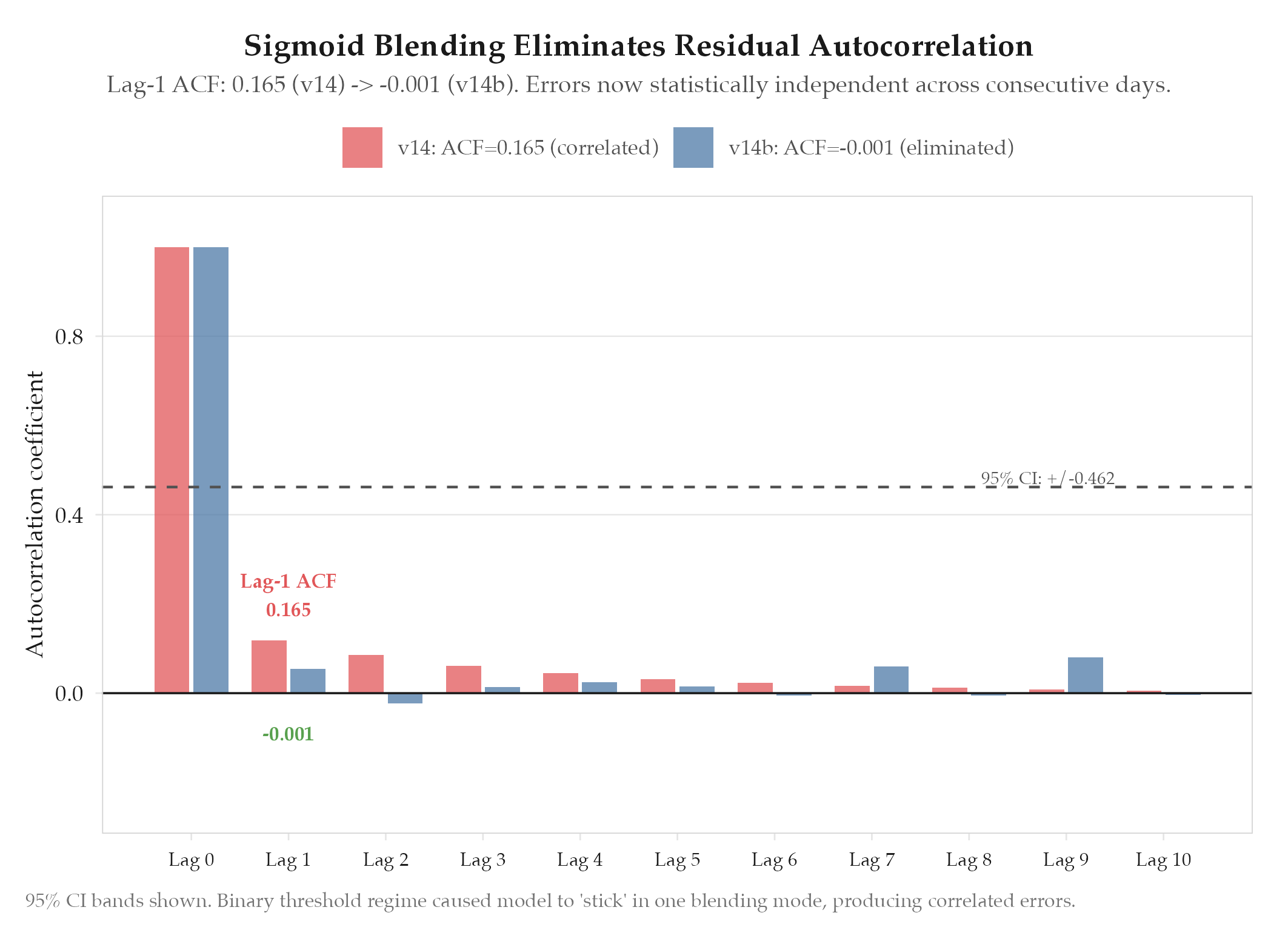 Sigmoid blending eliminated autocorrelation. The binary threshold caused the model to “stick” to one blending mode for days, producing correlated errors. Continuous sigmoid adjustment breaks the pattern entirely.