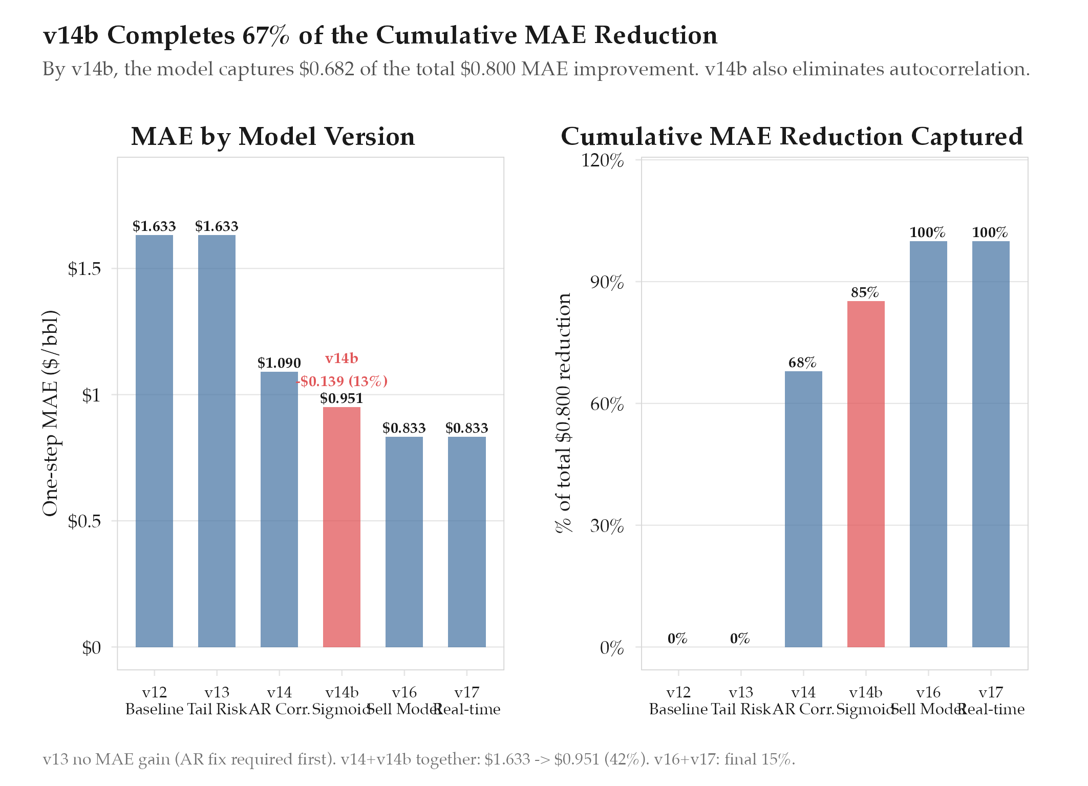 | MAE vs v13 | $1.633 | $0.951 | -$0.682 (42%) |