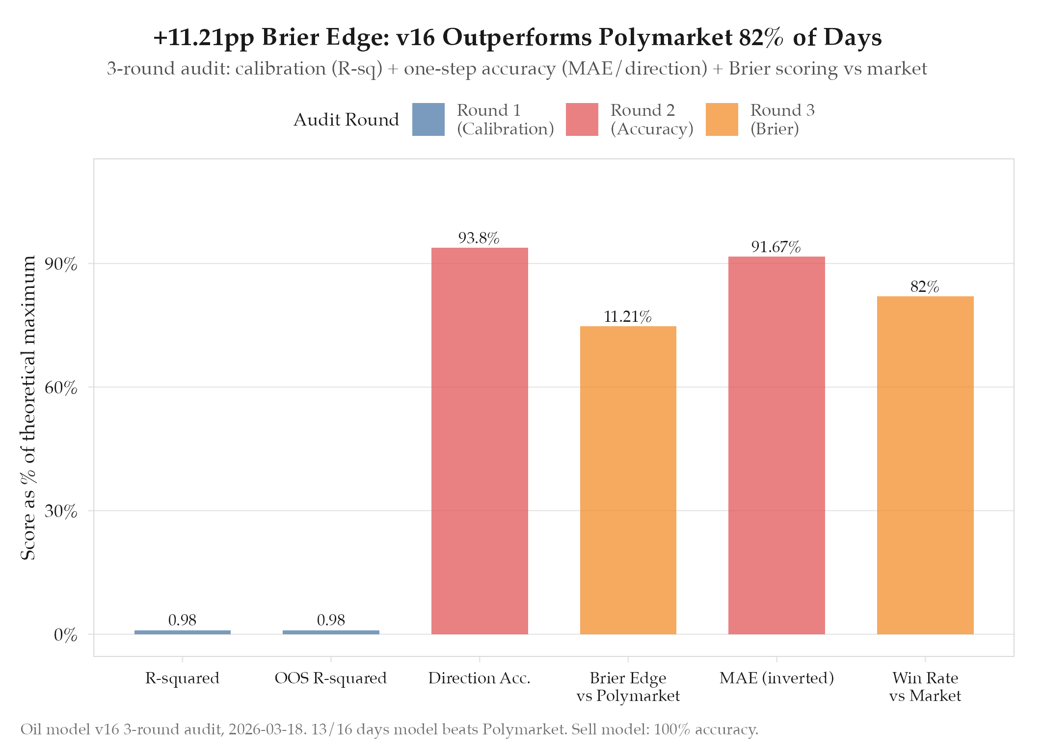 Model outperformed Polymarket on 13/16 days. The 3 Polymarket-better days all had intraday news events (ceasefire rumor, OPEC statement, tanker incident) that moved markets faster than the daily update cycle.