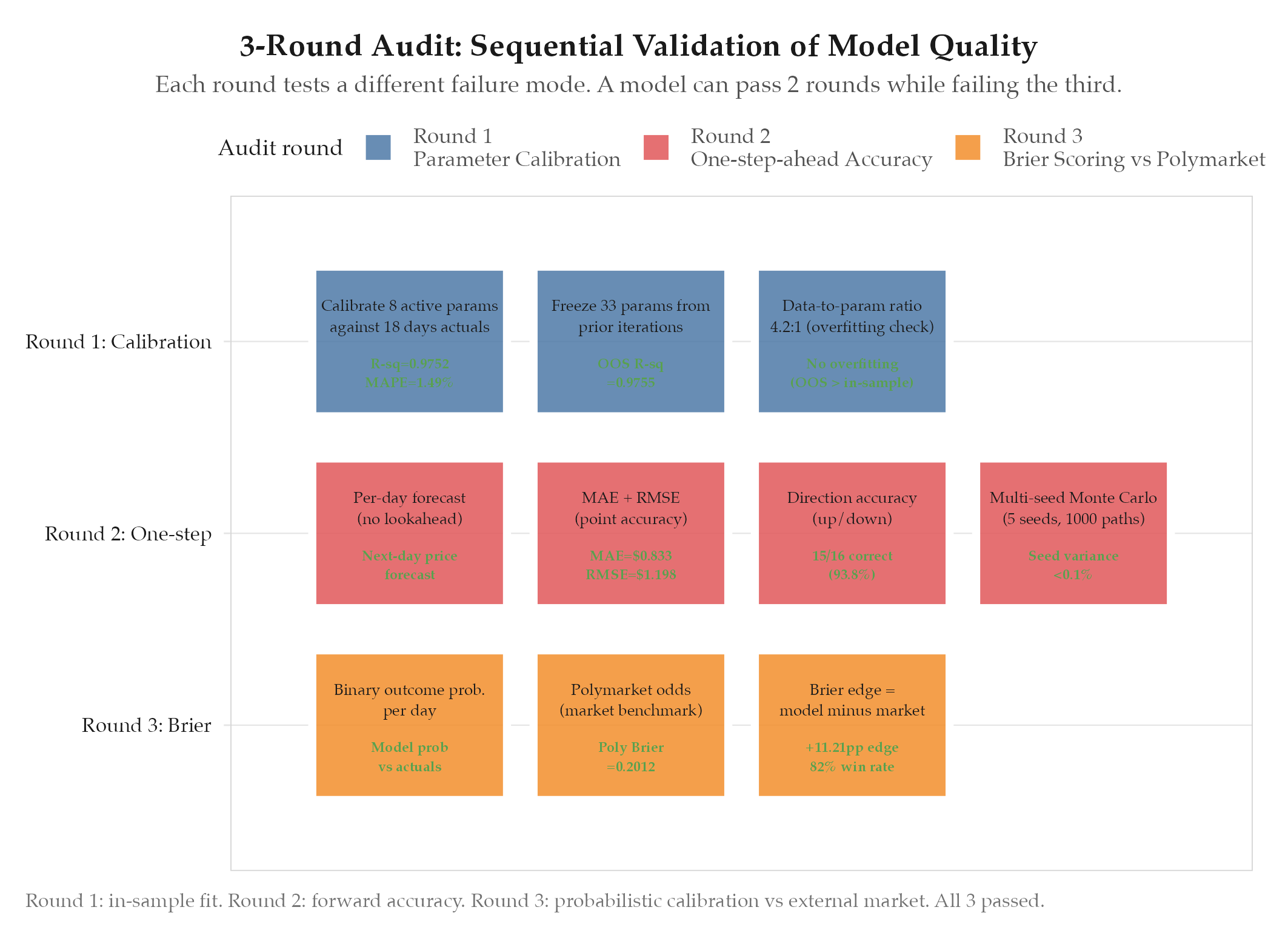 A 3-round quantitative audit with one-step-ahead forecasting, multi-seed Monte Carlo, and Brier scoring against Polymarket will validate the v16 model’s calibration beyond in-sample R-squared. In-sample R-squared confirms historical fit but says nothing about forward accuracy or probability calibration. Each round tests a different quality dimension : fitting, forecasting, and calibration : so that a model cannot pass the full audit by gaming one metric while failing the others.