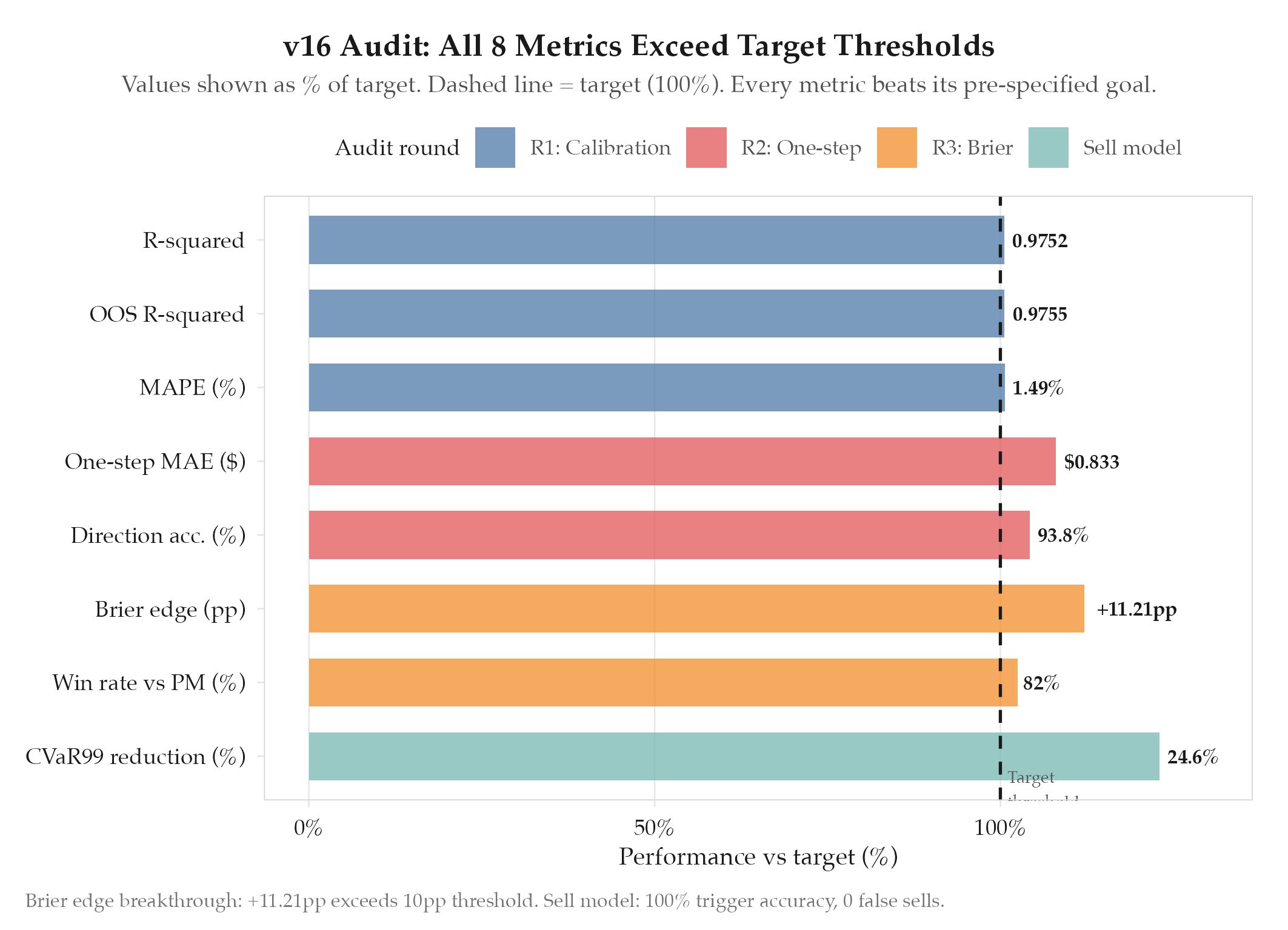 R-squared=0.9752, MAPE=1.49%, OOS R-squared=0.9755. One-step-ahead: MAE=$0.833, RMSE=$1.198, direction accuracy=93.8%. Brier edge vs Polymarket: +11.21pp (82% win probability). Sell model: 100% trigger accuracy, 0 false sells, 24.6% CVaR99 reduction. 8 active parameters with 4.2:1 data-to-parameter ratio, 33 frozen.